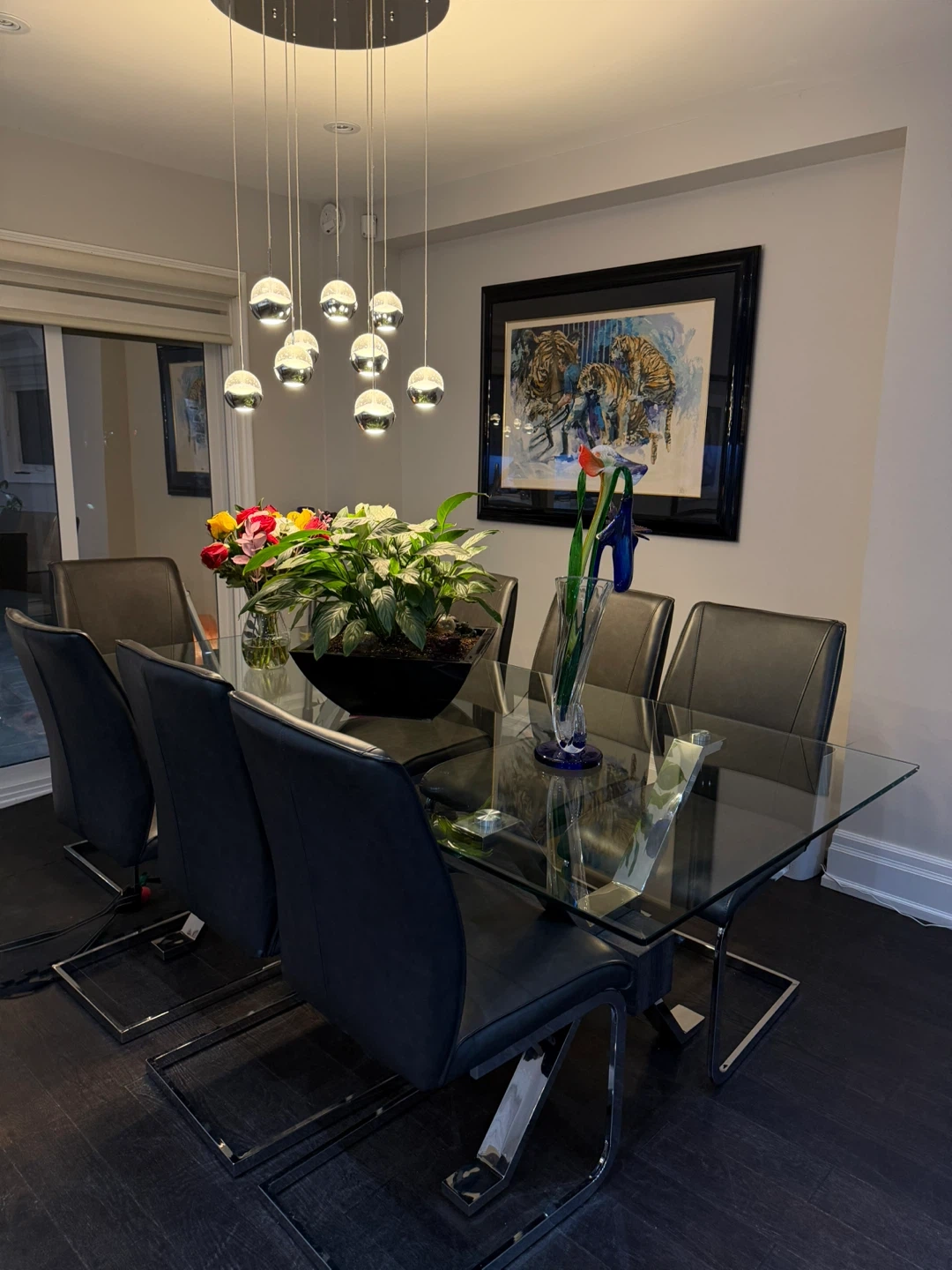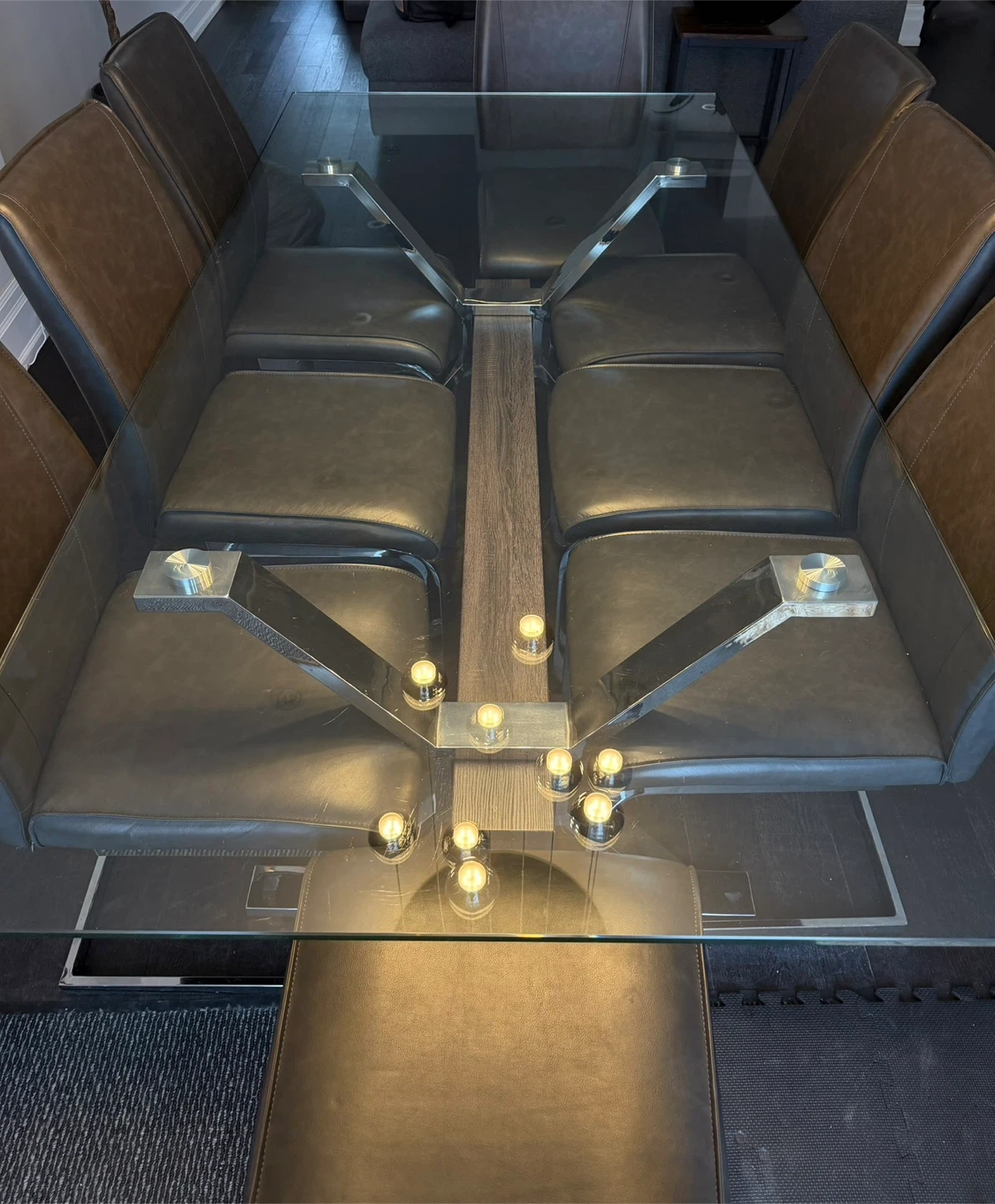 This set includes a sleek glass-top dining table with a sturdy metal base and eight comfortable leather chairs. The table's clear glass surface and contemporary design create a spacious feel. Chairs are upholstered in dark leather with chrome frames. This set is great for hosting dinners!