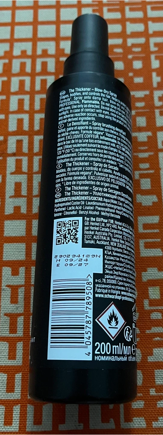 Schwarzkopf Professional Session Label The Thickener. This blow-dry spray helps to densify hair. It's 200 ml or 6.8 oz net weight. Contains Water, Alcohol Denat., and Hydrolyzed Corn Starch.