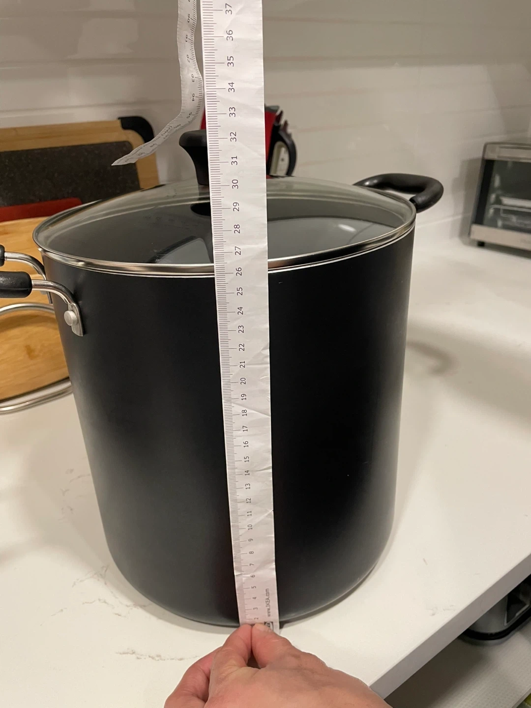 Selling a large black stock pot with a glass lid. It's in great shape and ready for making soups, stews, or boiling pasta. The pot measures approximately 36cm in height and 27cm in diameter.