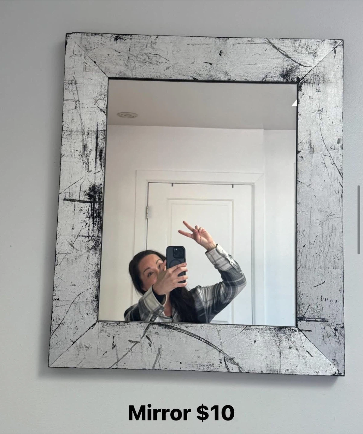 This is a decorative wall mirror with a distressed silver and black frame. It's perfect for adding a touch of style to any room. The frame has a unique, textured finish. Pick up by Tuesday night