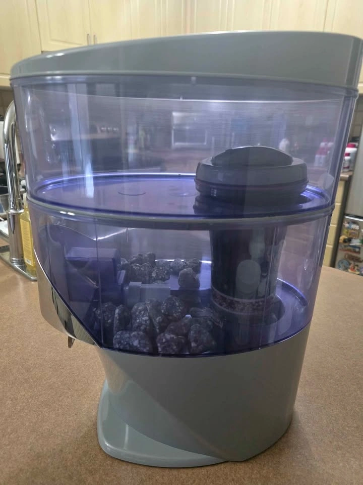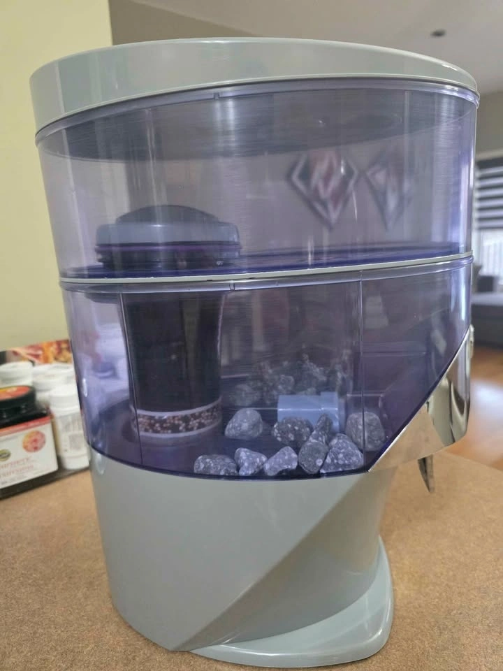 Clean Nikken PiMag Waterfall water filter dispenser. Has clear top reservoir and bottom section with filter and mineral stones. Dispenses purified water.