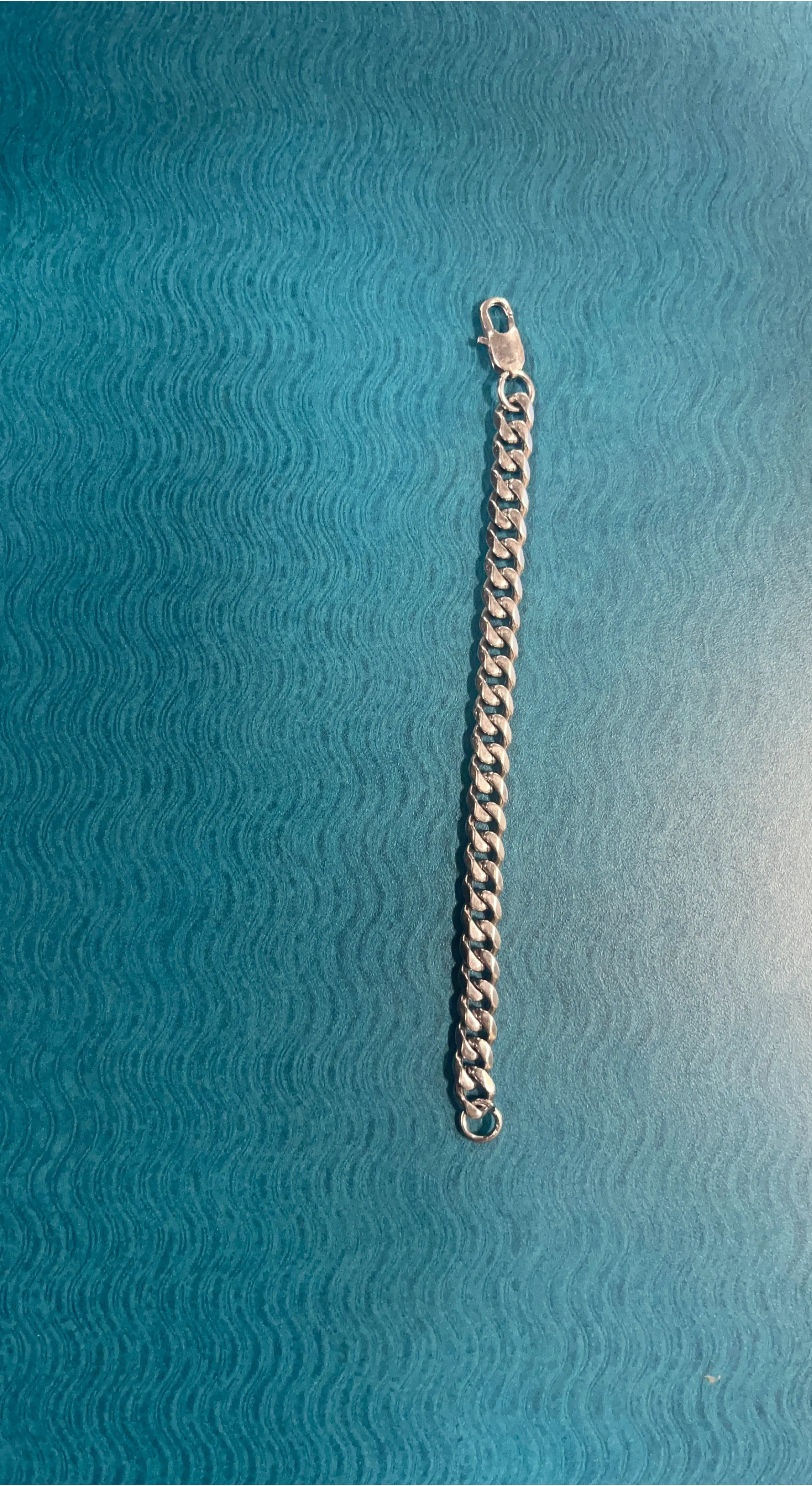 A silver chain bracelet with a classic curb link design. It features a sturdy lobster clasp for secure wear. This bracelet is a versatile accessory for everyday style.
