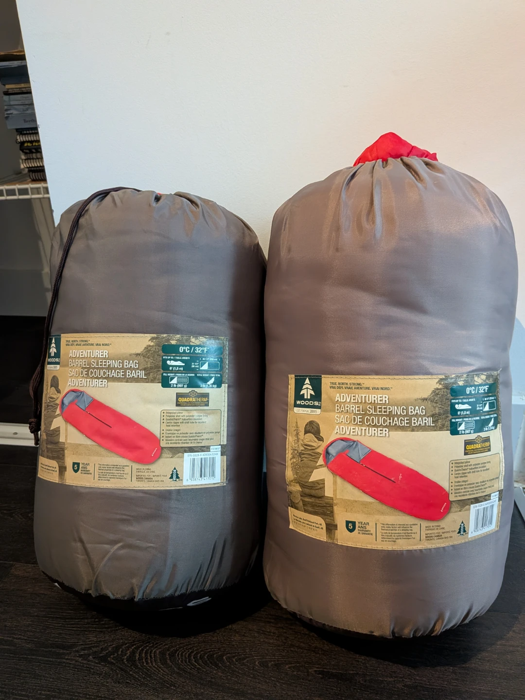 Two Woods Adventurer barrel sleeping bags. Rated for 0°C (32°F) with a QuadsThera™ fill. Suitable for use up to 1.8 meters in height. Each bag weighs approximately 2 lb (907 g).