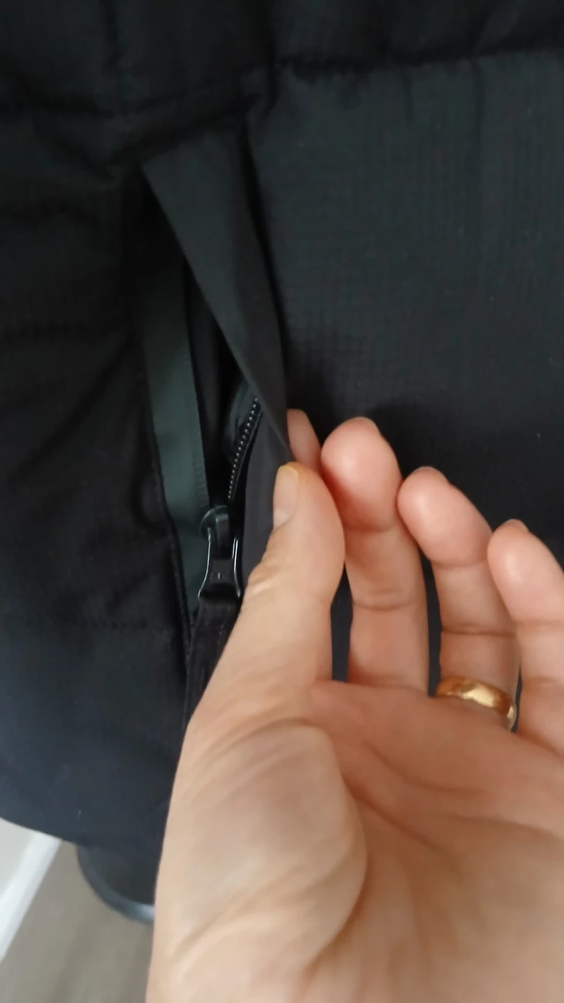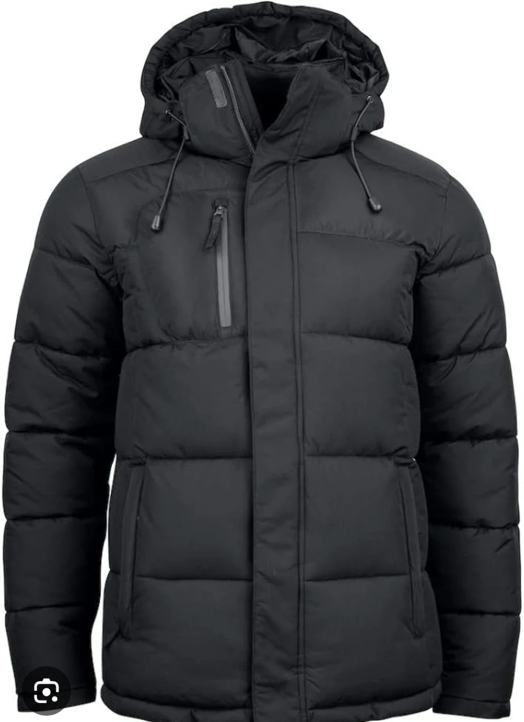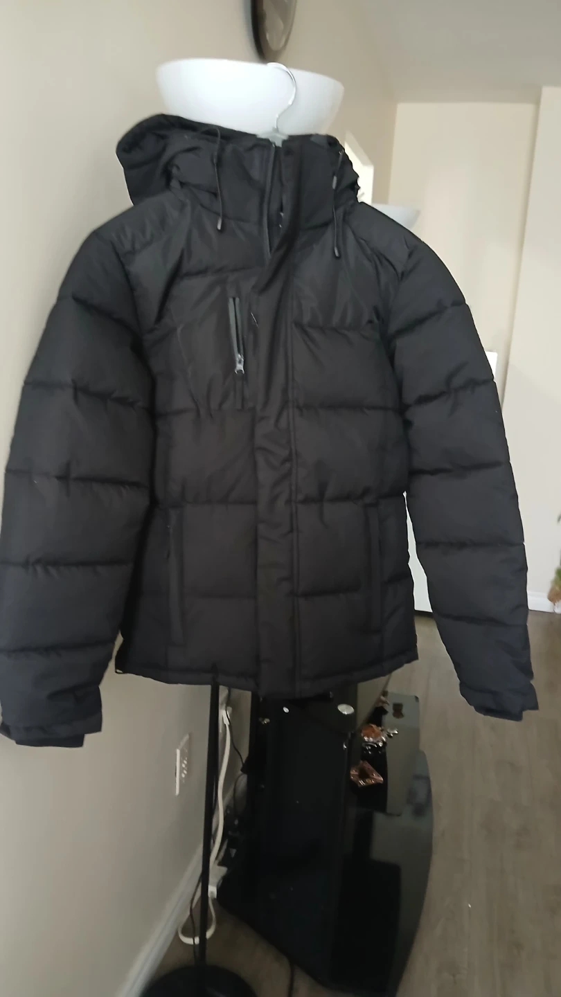 Here's a black puffer jacket that's perfect for staying warm during the colder months! It features a hood and several pockets, including a zippered one on the chest. It's in great condition and ready for a new owner