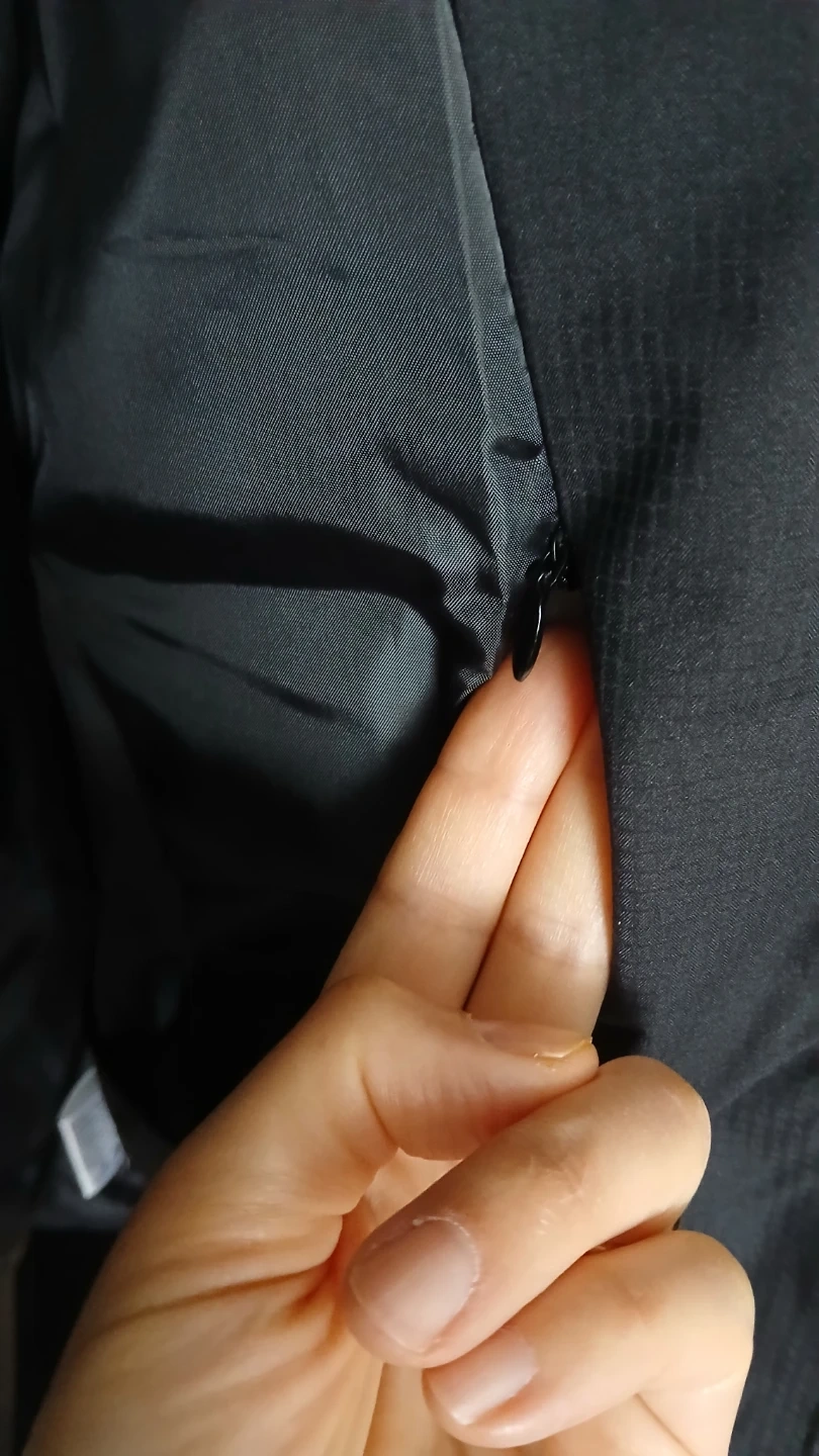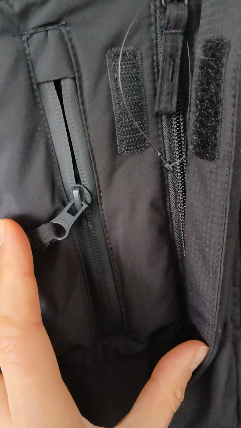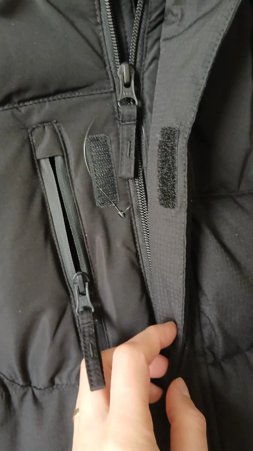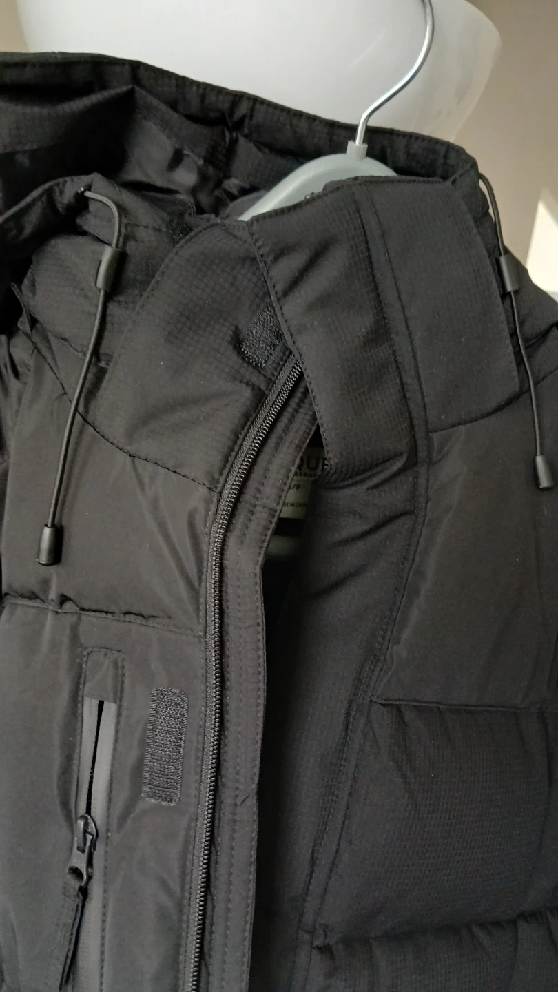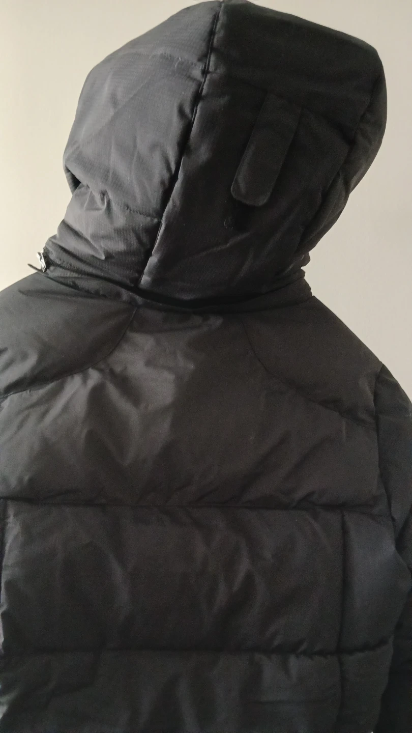 Here's a black puffer jacket that's perfect for staying warm during the colder months! It features a hood and several pockets, including a zippered one on the chest. It's in great condition and ready for a new owner