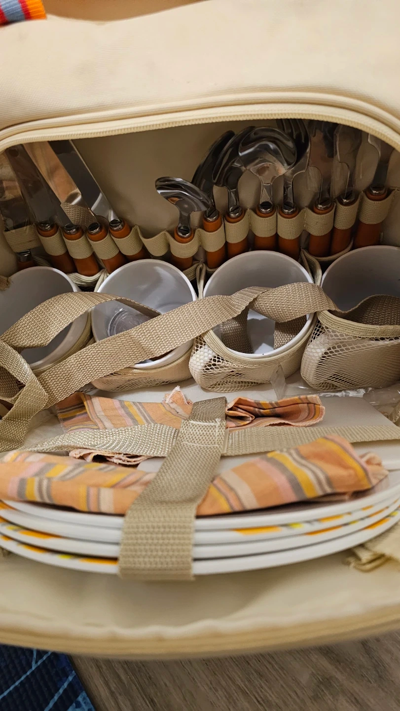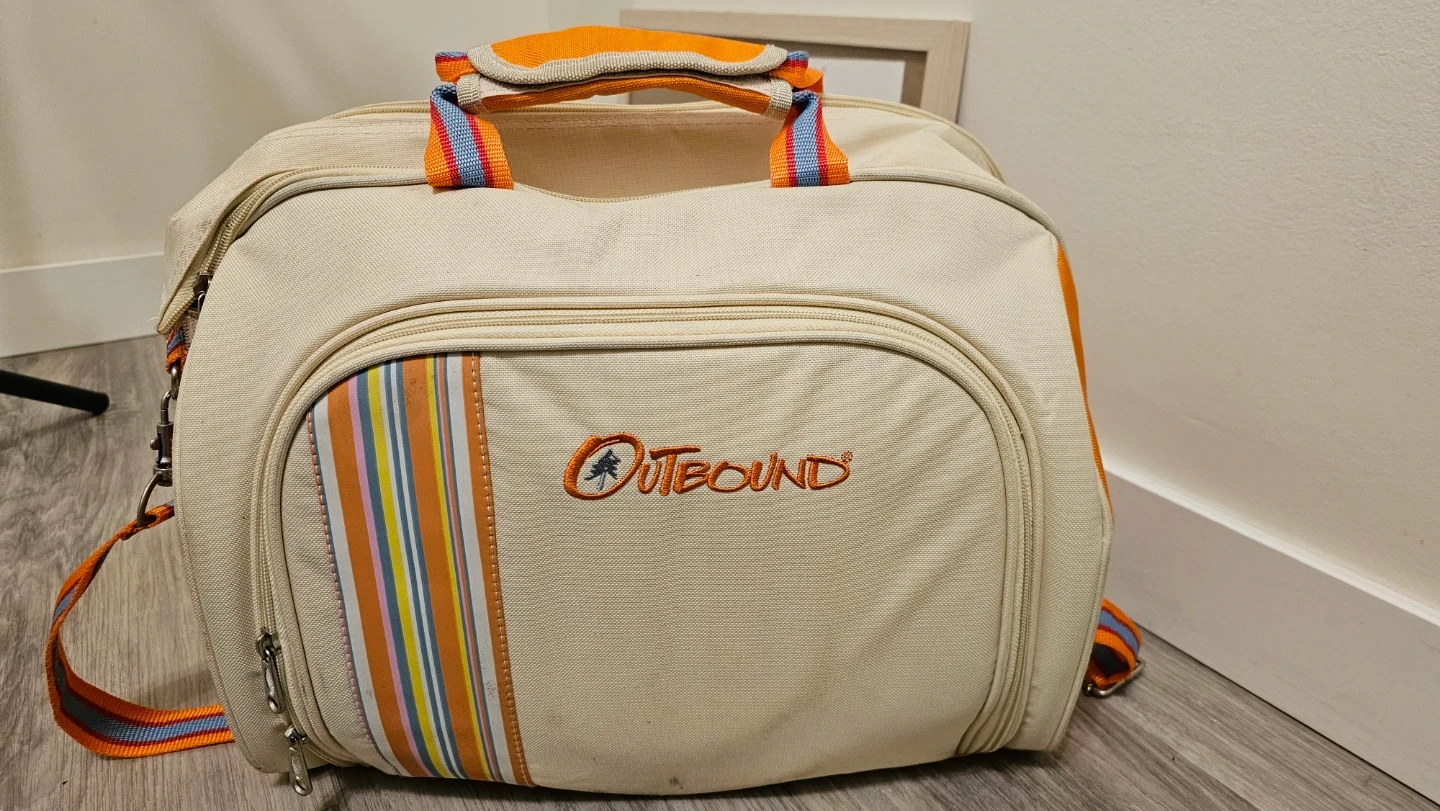 This is an Outbound picnic basket with plates, cutlery, cups, and napkins. It's made of a durable canvas material. This set is great for outdoor meals!
