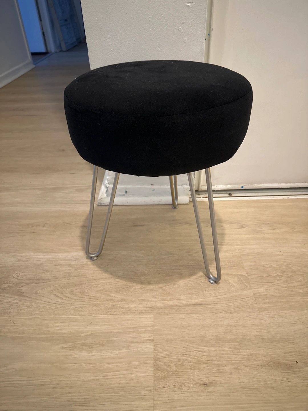 Selling a round foot stool with a black cushion top and silver metal legs. It's in great condition and would be a nice addition to any room!