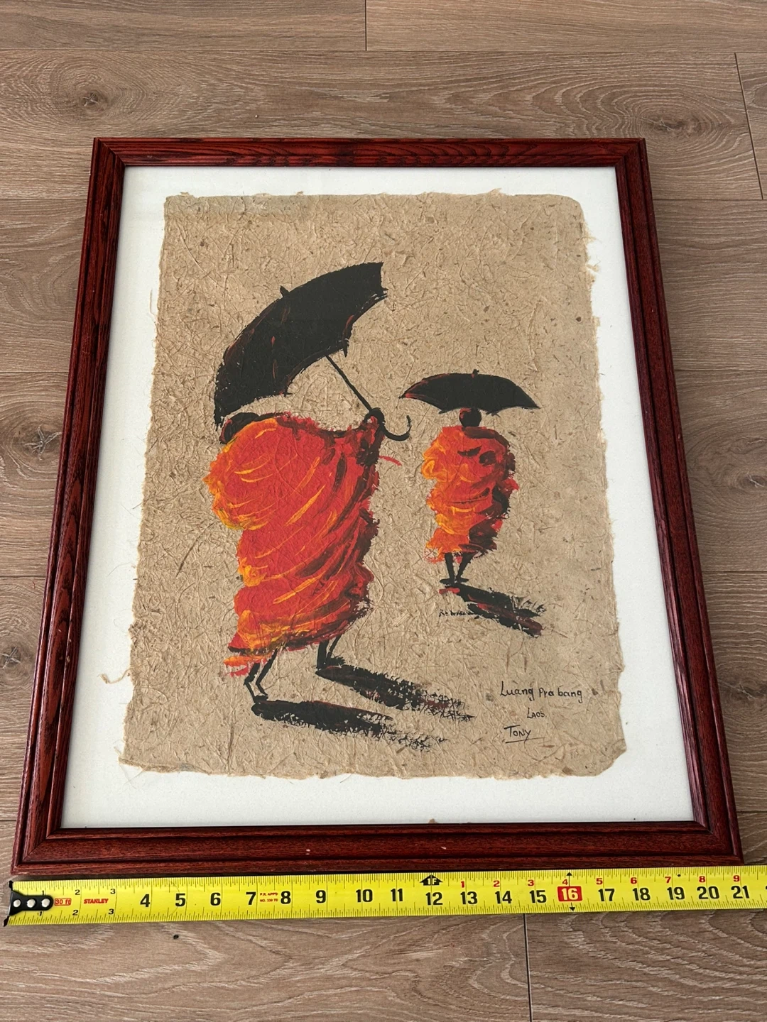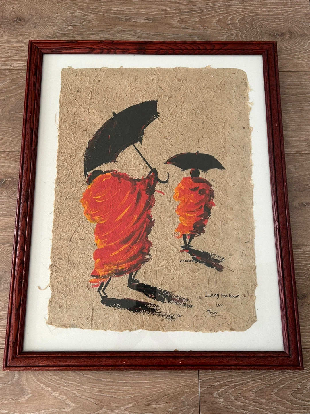 Hand-signed by Tony in the lower right corner and inscribed with “Luang Prabang, Laos,” this piece shows two monks in saffron robes under black umbrellas. The artwork is framed in a deep wood-grain finish with light wear consistent with age, professionally matted, and wired on the back for easy hanging. Ideal for a living room, office, or hallway, this painting brings a peaceful and culturally rich accent to any space.