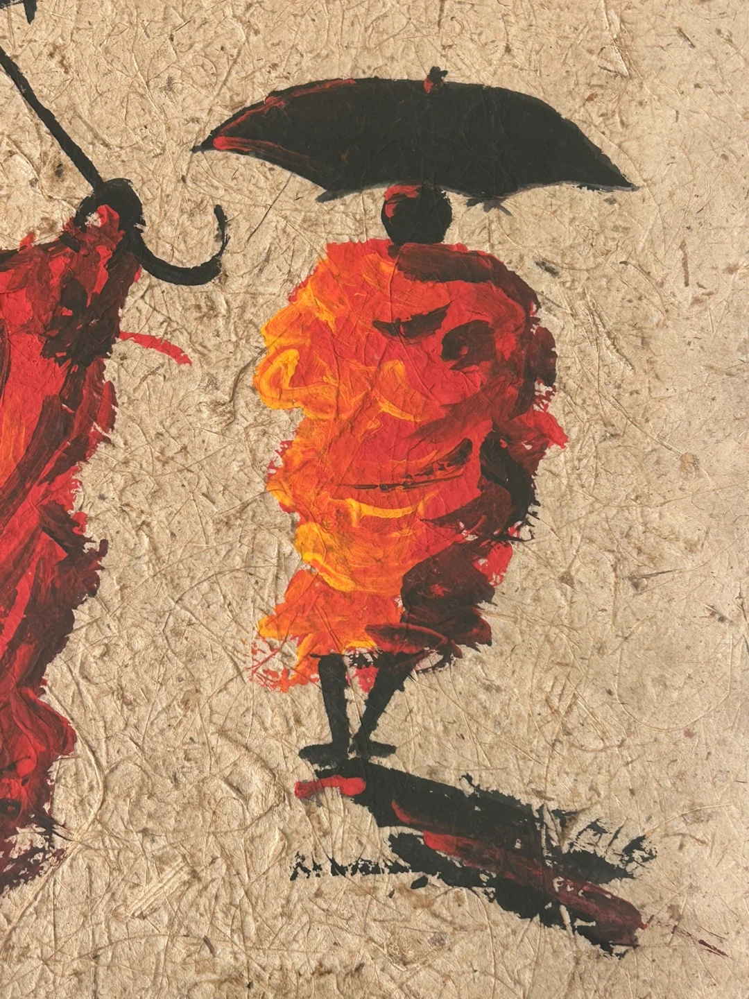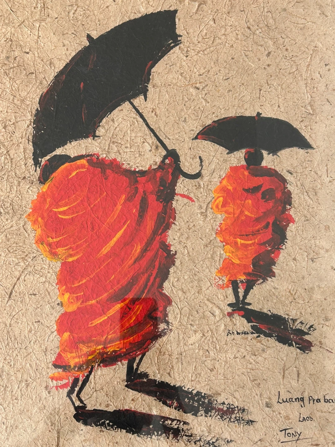 A beautiful and evocative original painting depicting Buddhist monks with umbrellas, capturing a classic scene from the spiritual capital of Laos, Luang Prabang. Painted on traditional textured handmade paper, the artwork has a rich, organic feel that enhances its serene, timeless energy.