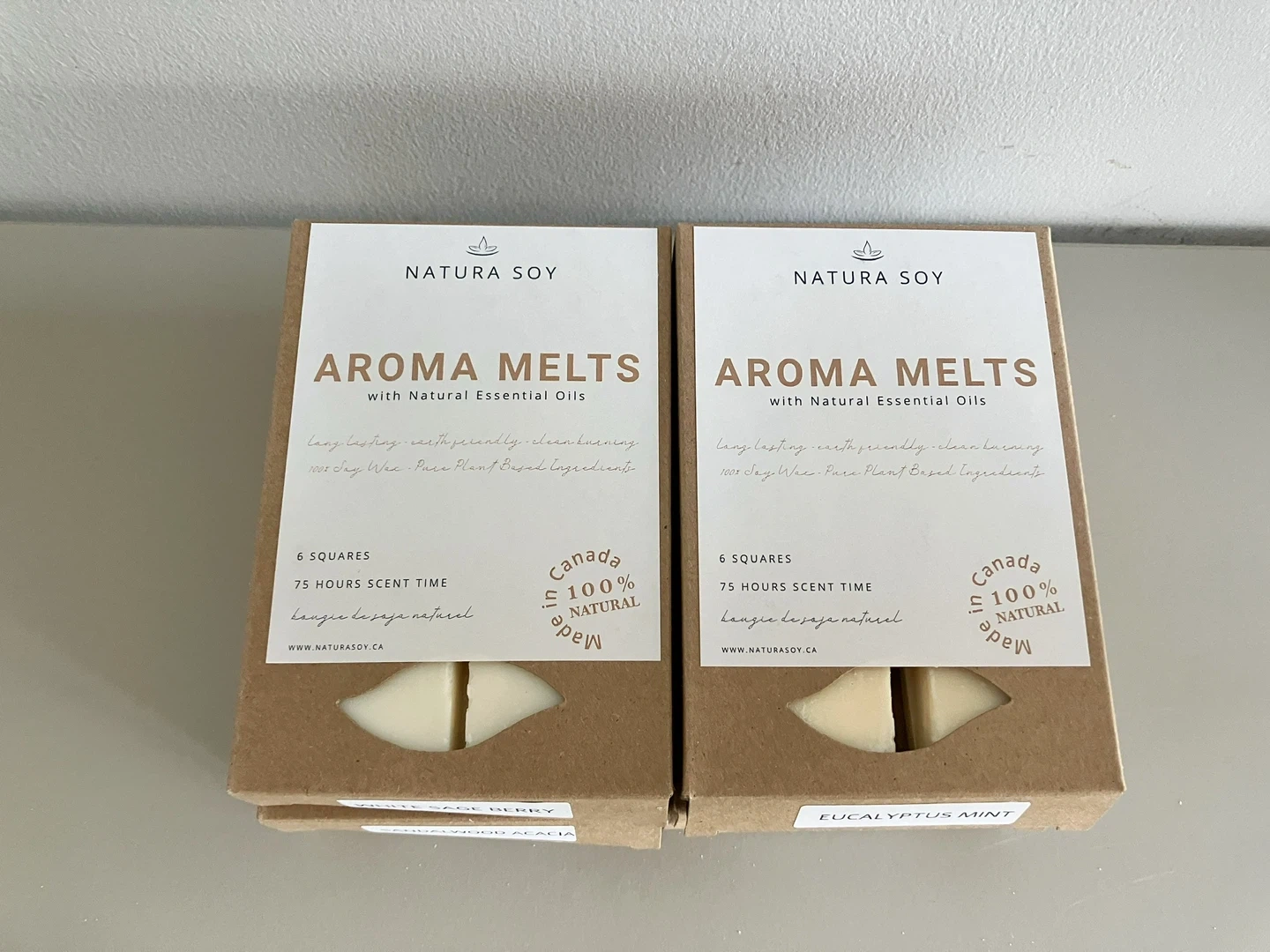 6 boxes of Natura Soy Aroma Melts with Natural Essential Oils. Each box contains 6 squares and provides 75 hours of scent time.