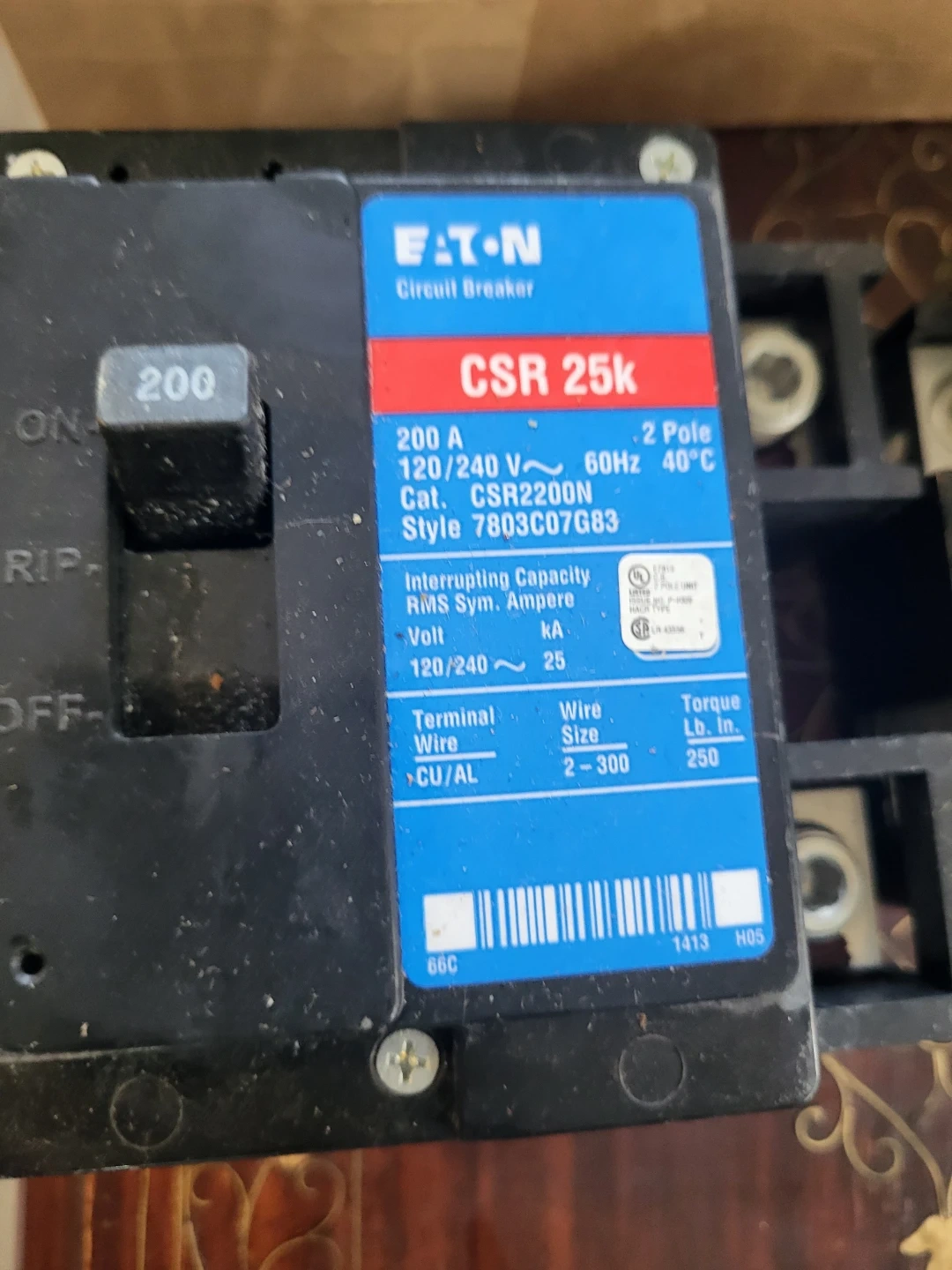 Eaton CSR 25k 2 pole circuit breaker. Rated for 200A, 120/240V, and 60Hz. Interrupting capacity is 25kA at 120/240V. Terminal wire is CU/AL, wire size 2-300, torque 250 Lb. In. This breaker is suitable for electrical panel upgrades or replacements.