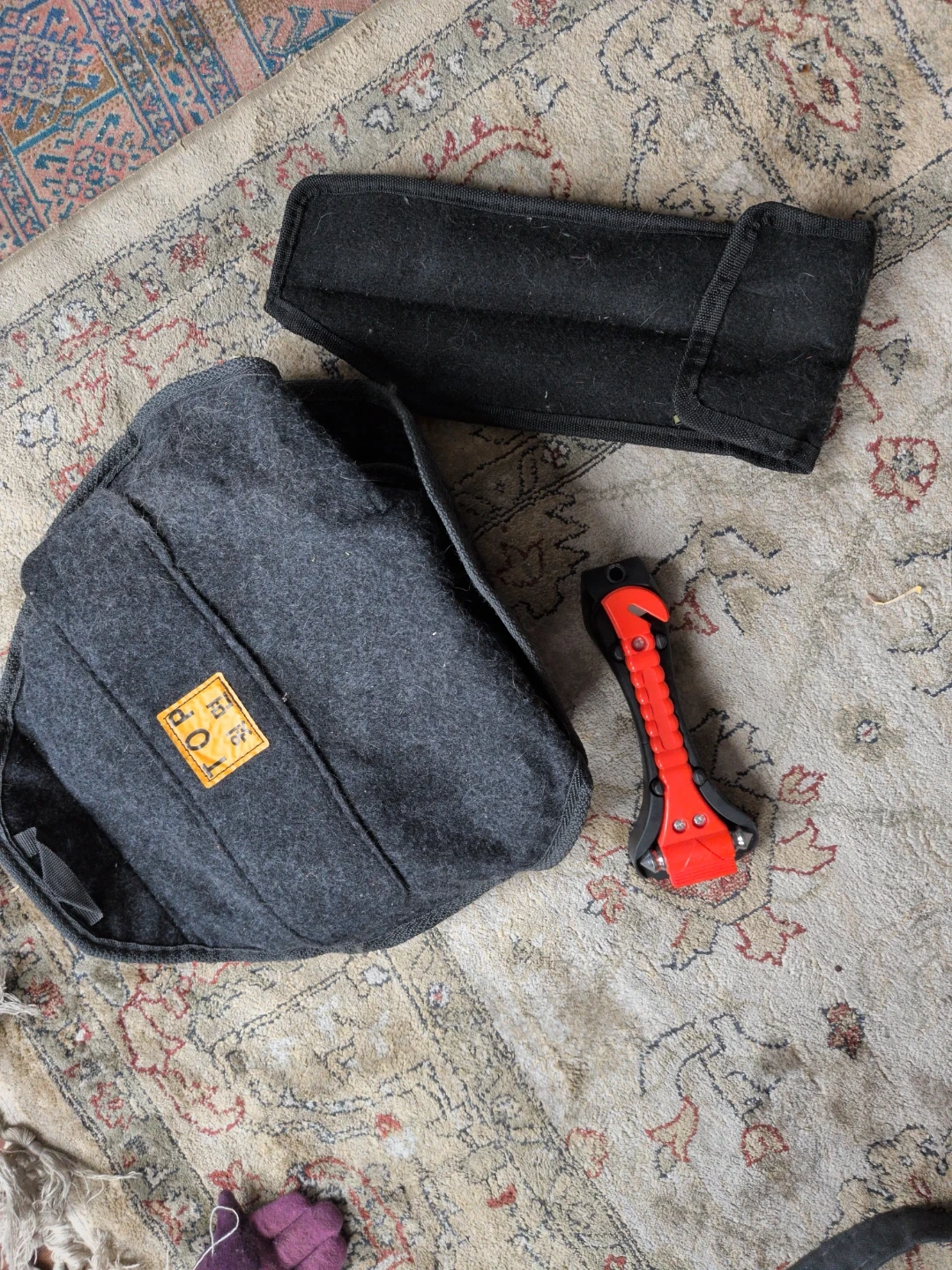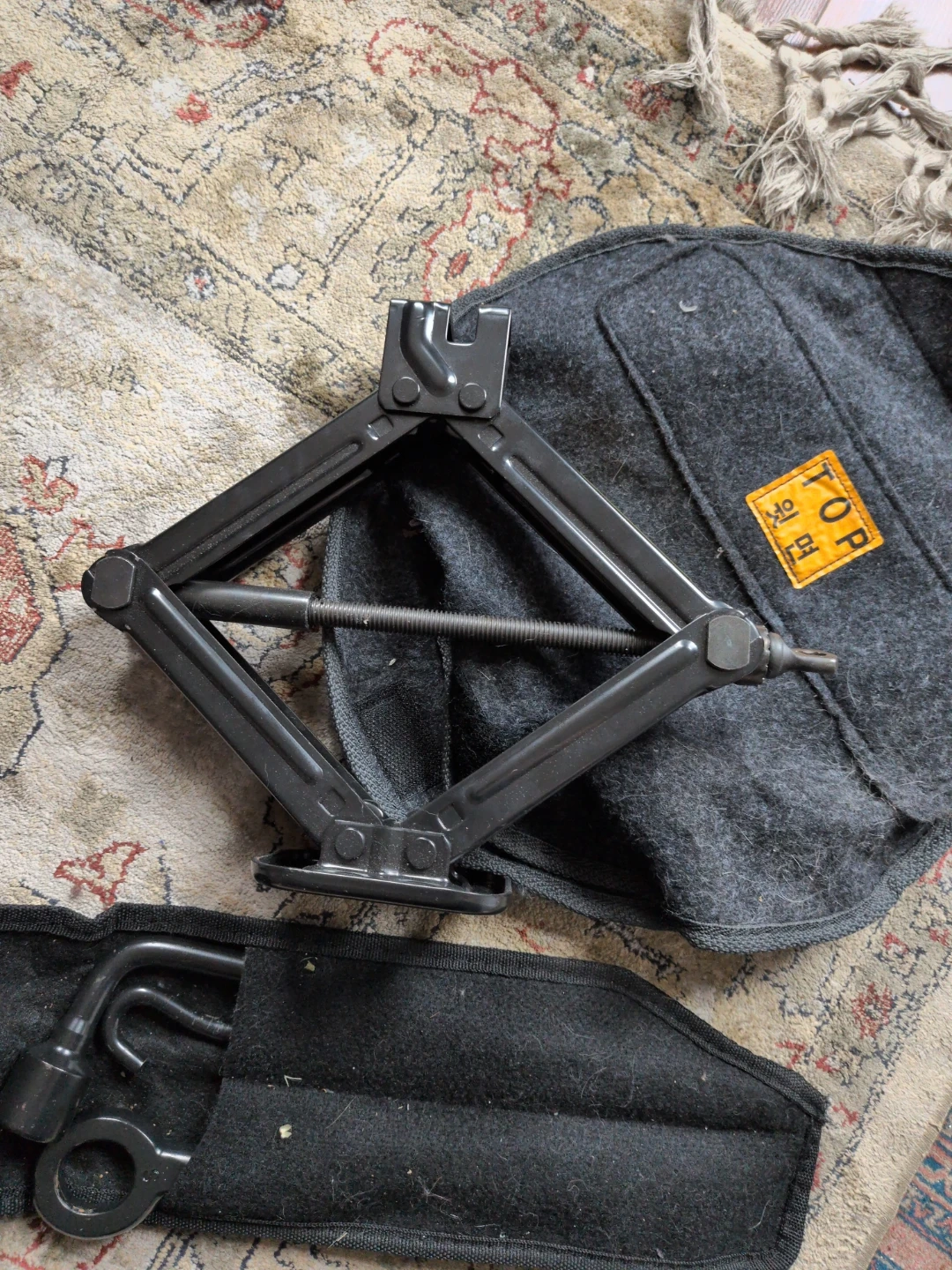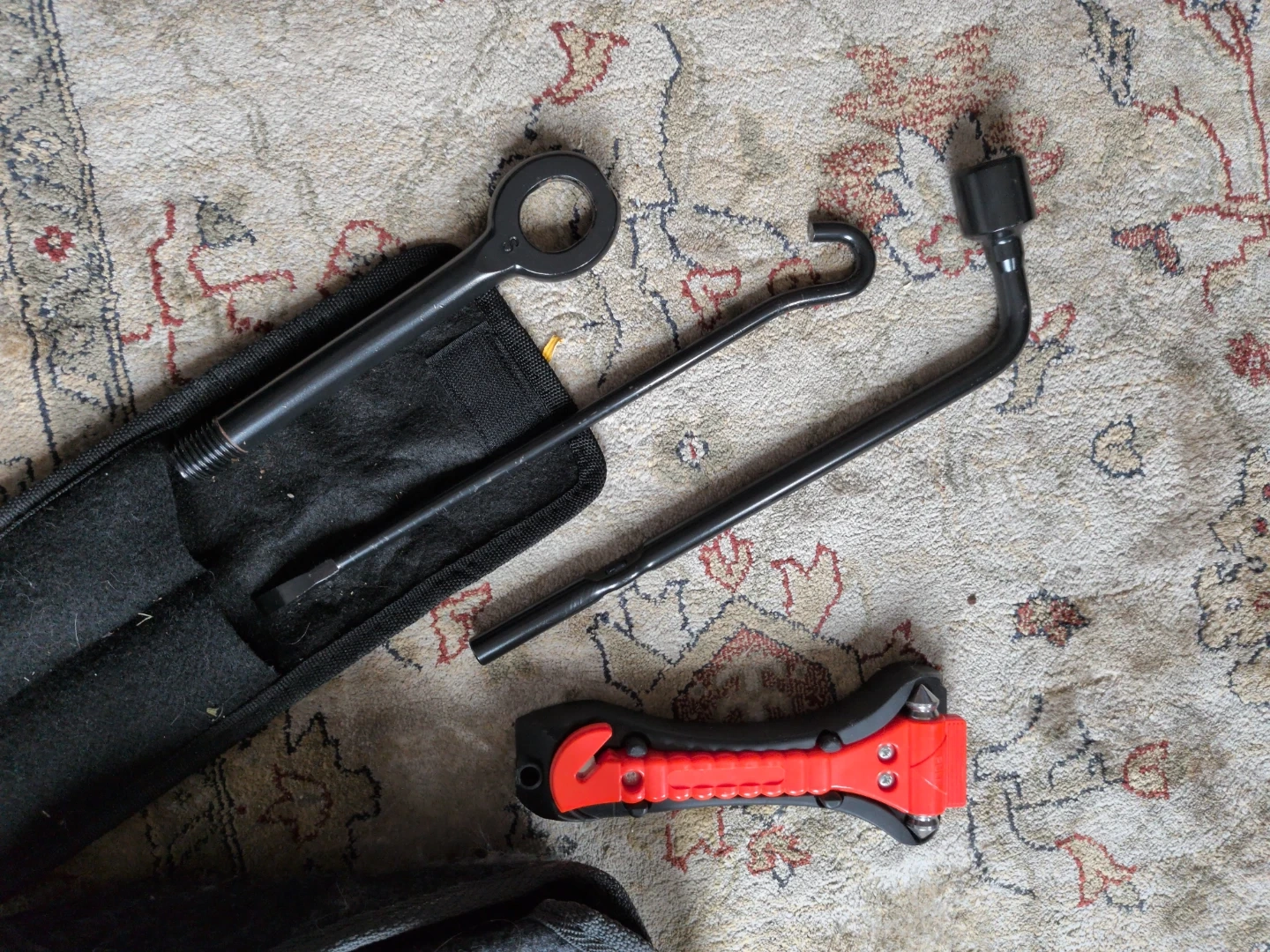 Includes a scissor jack, tire iron, lug wrench, and a safety hammer with a seatbelt cutter. Comes with their original felt fabric holders. Has some cat hair on em.
