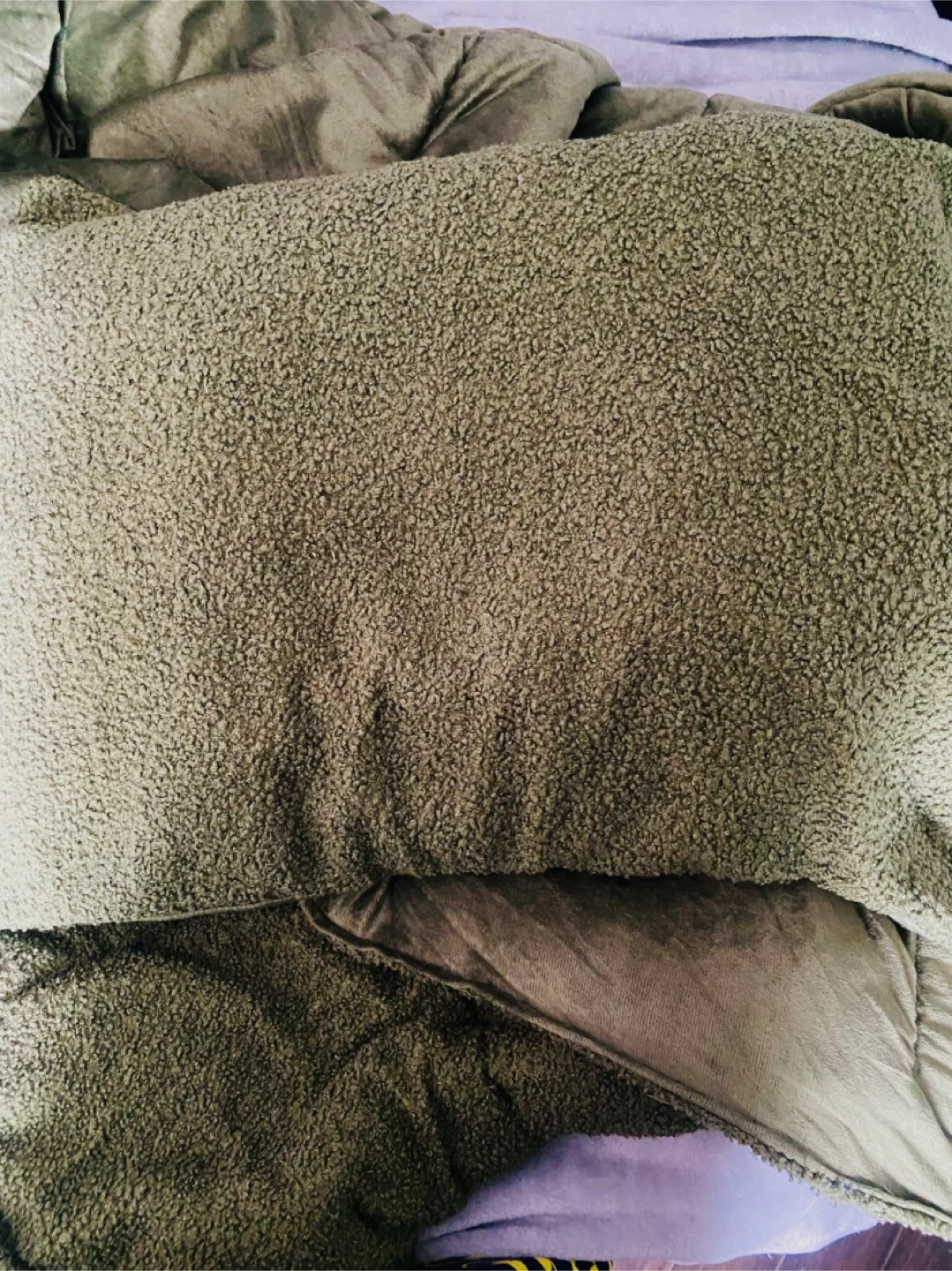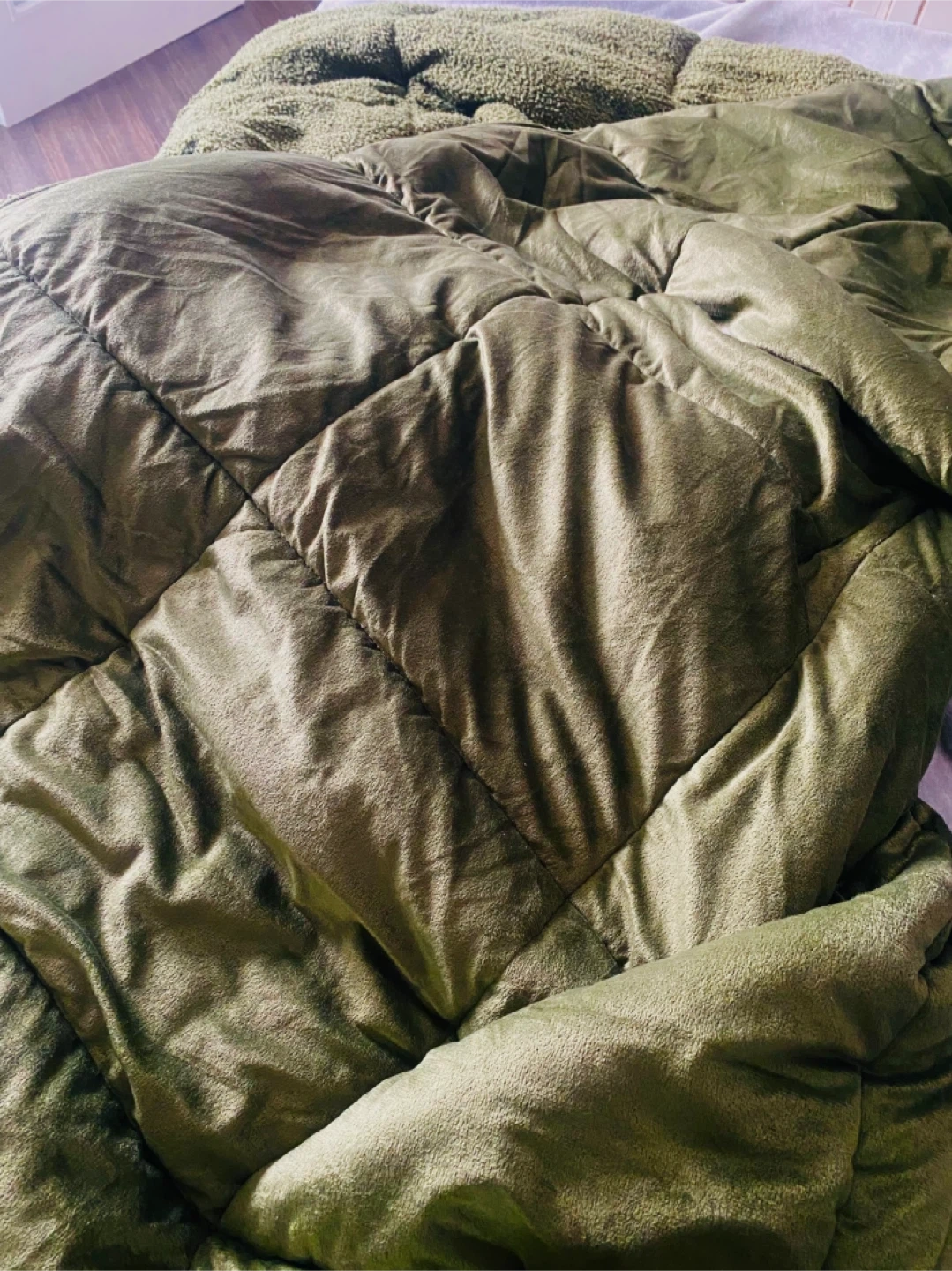 nice forest green queen size comforter and two pillow covers along with a black mattress cover. brand new jus didnt like the colour, mattress cover will be freshly washed the day before a pick up is planned. comforter is two sided, one texture is like a soft almost poodle like texture (hence the curly looking fabric on one side, it’s very soft) and the other is a soft velvet.