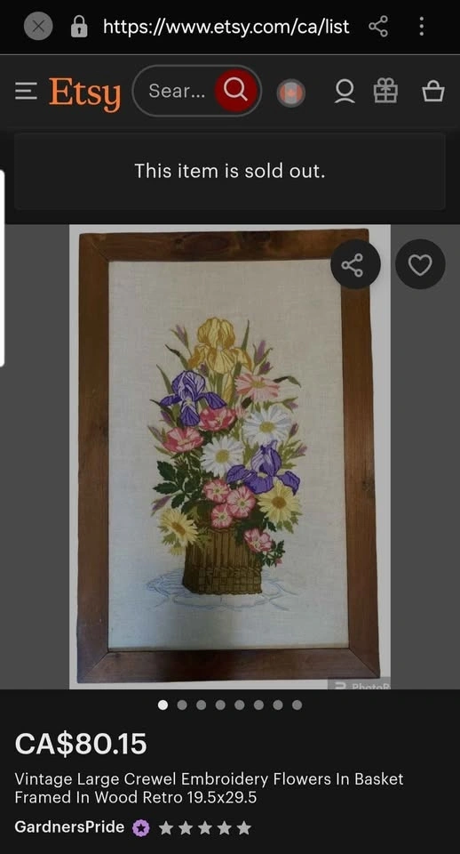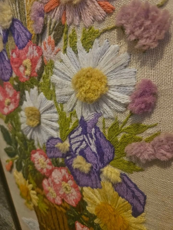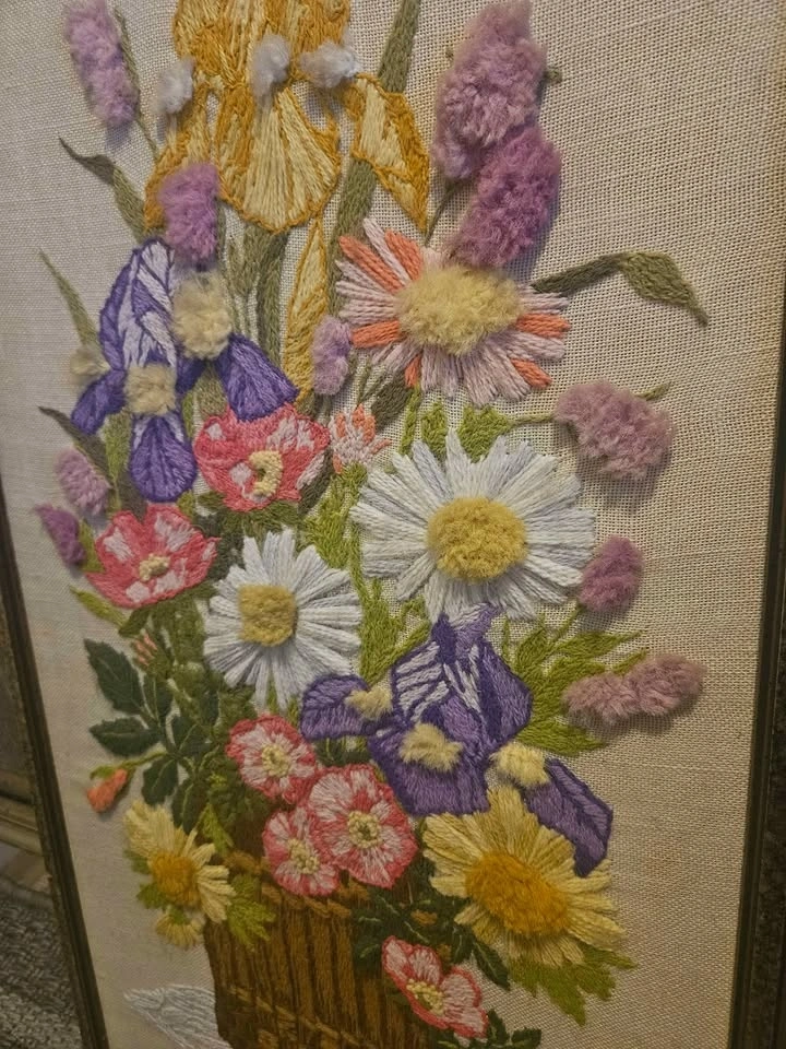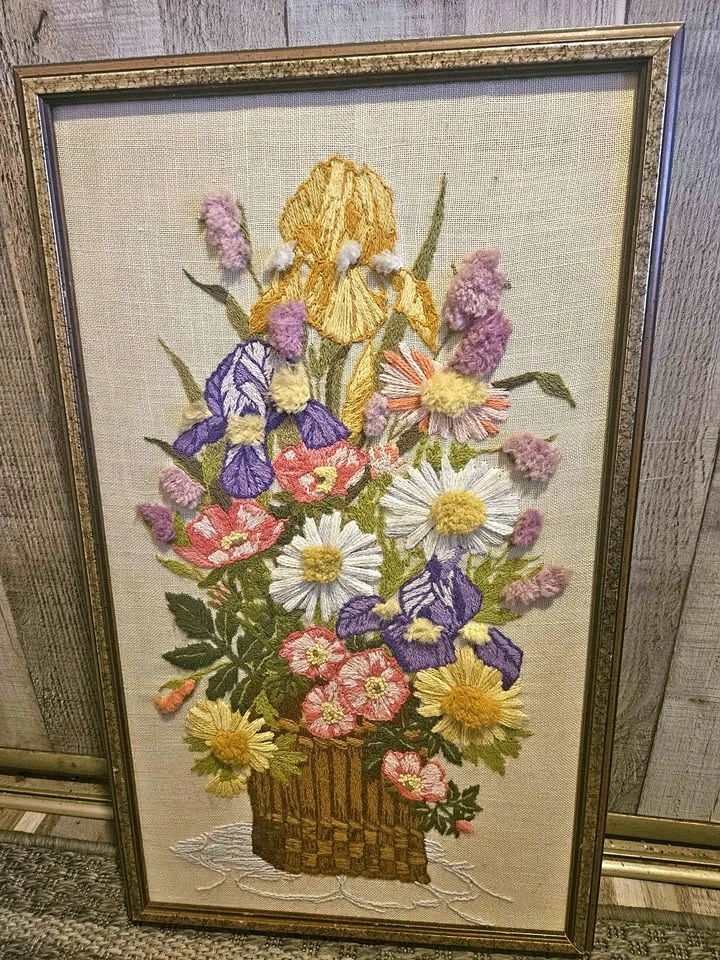 This vintage piece is a beautiful large crewel embroidery featuring colorful flowers in a basket, expertly handmade with attention to detail. The piece is framed in wood, giving it a retro feel that will complement any room. It is in good condition overall. The stitching is flawless, only callout is the damaged paper backing - which can be easily cleaned up (see photos). Measures 29.5”x19.5”. Smoke free shop. Pick up South London. No porch pick up. Exact cash.