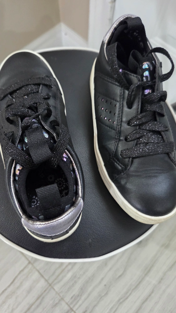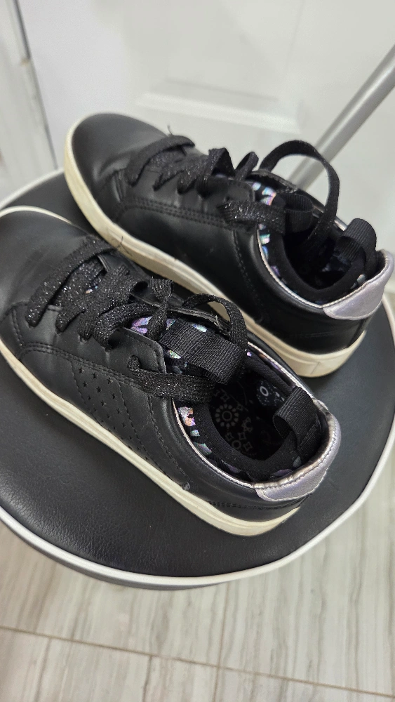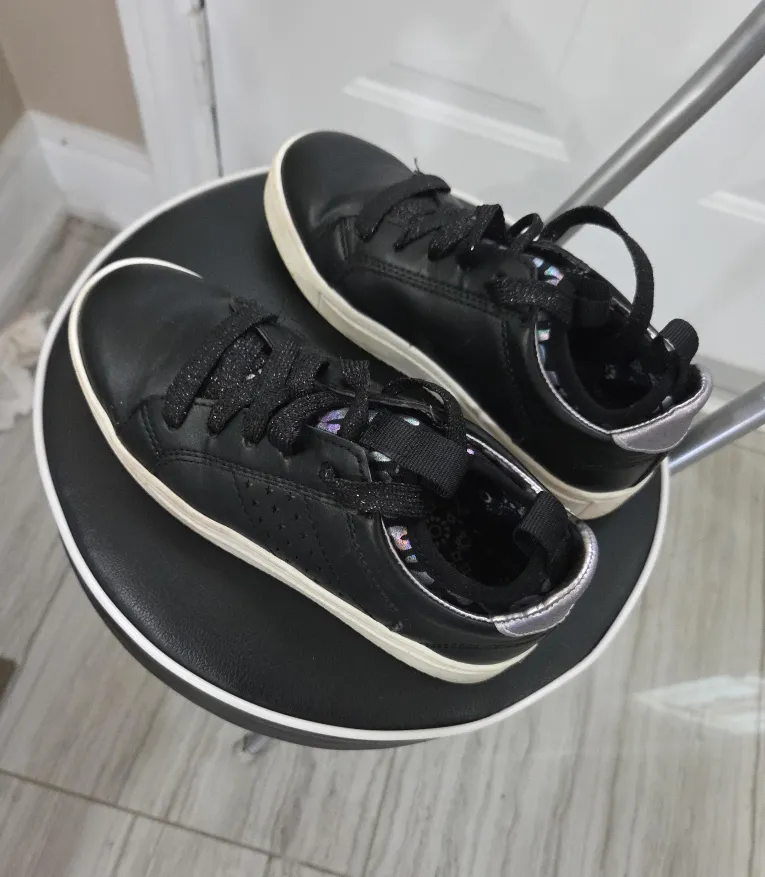 Black sneakers with white soles. Feature glitter laces. Designed with a small metallic silver detail. You can be assured that these are perfect for a casual walk or a relaxing stroll. kids size 2,ages 4 to 8