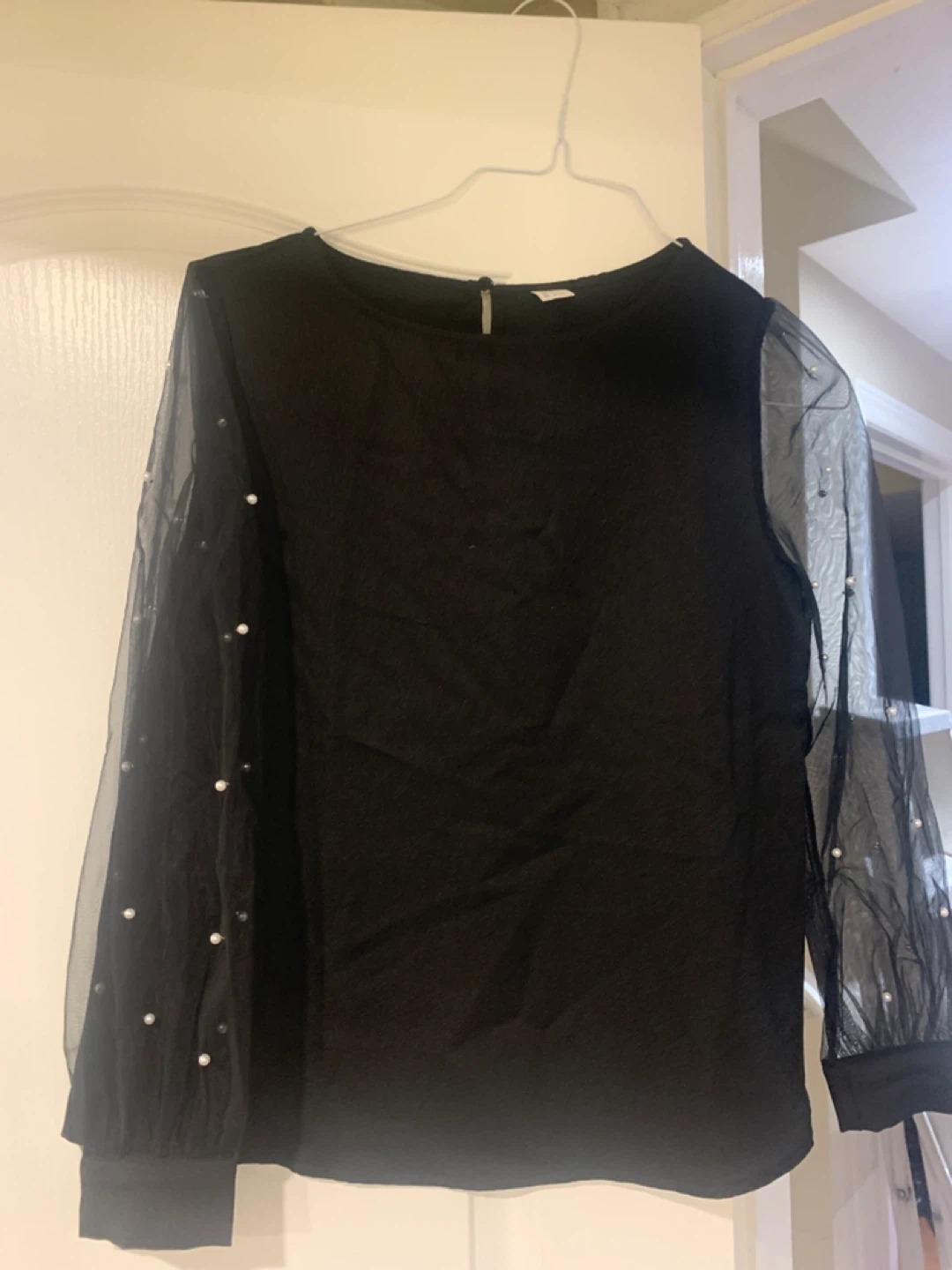 Selling a cute H&M black blouse! It's a size small. The sleeves are sheer with little pearl-like embellishments. It's in great condition and ready for a new home!