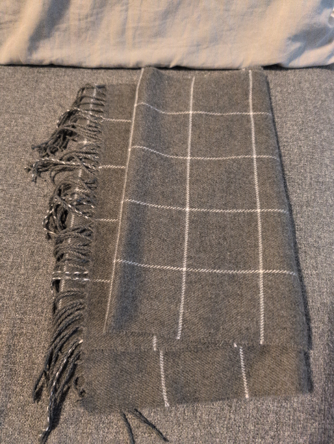 A cozy grey scarf with a classic plaid pattern and fringed edges. Perfect for adding a touch of warmth and style to any outfit!