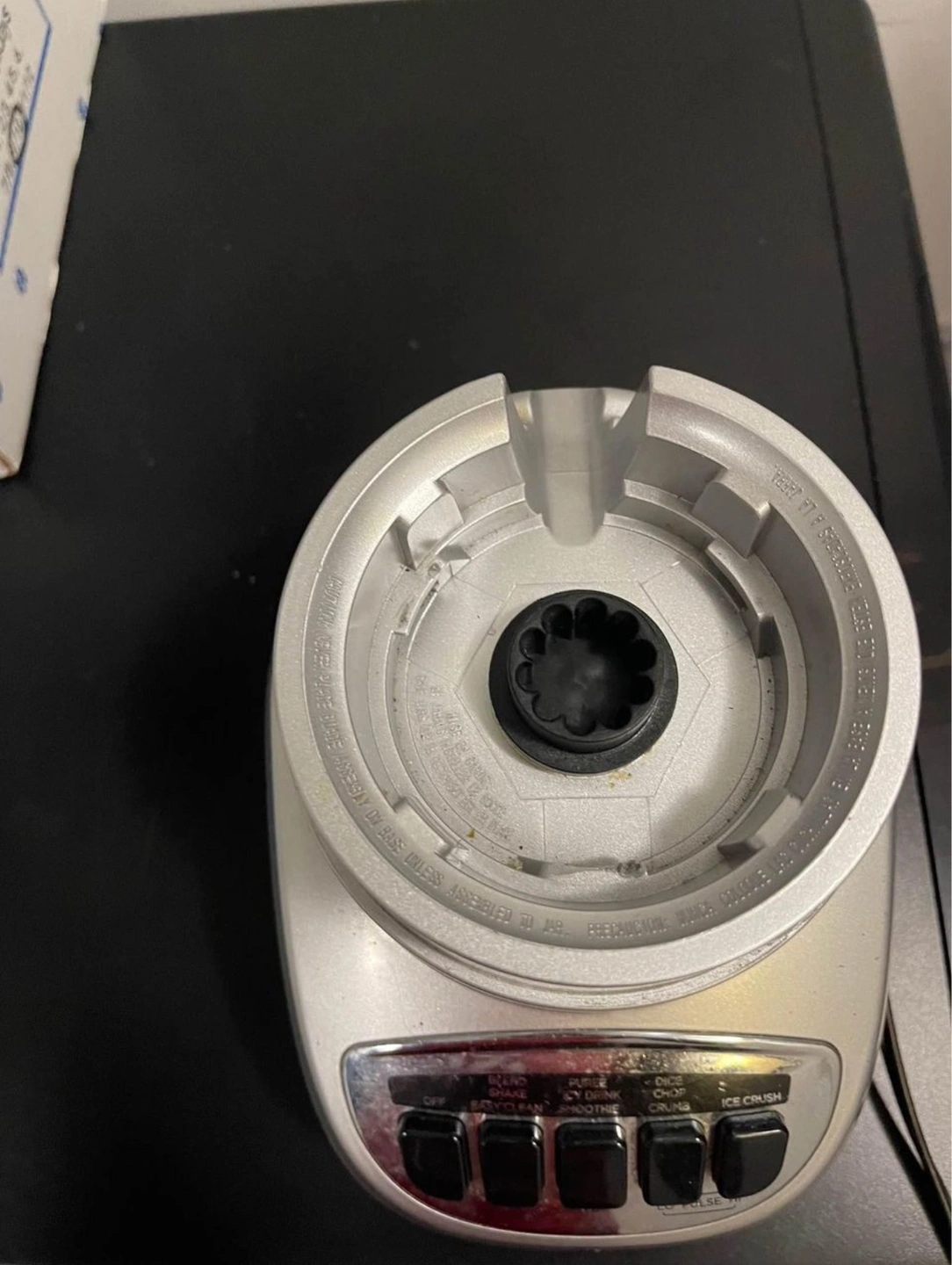 Blender with multiple settings including blend, pulse, chop, drink/smoothie, and ice crush. Comes with a lid and a black rubber seal.