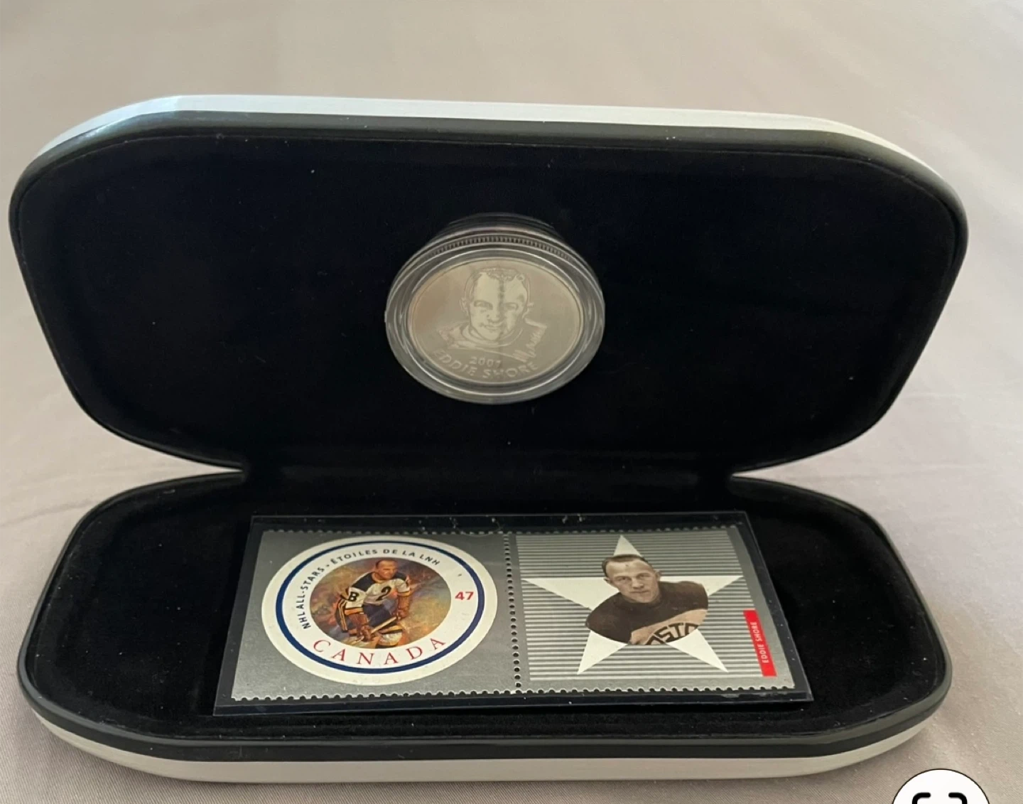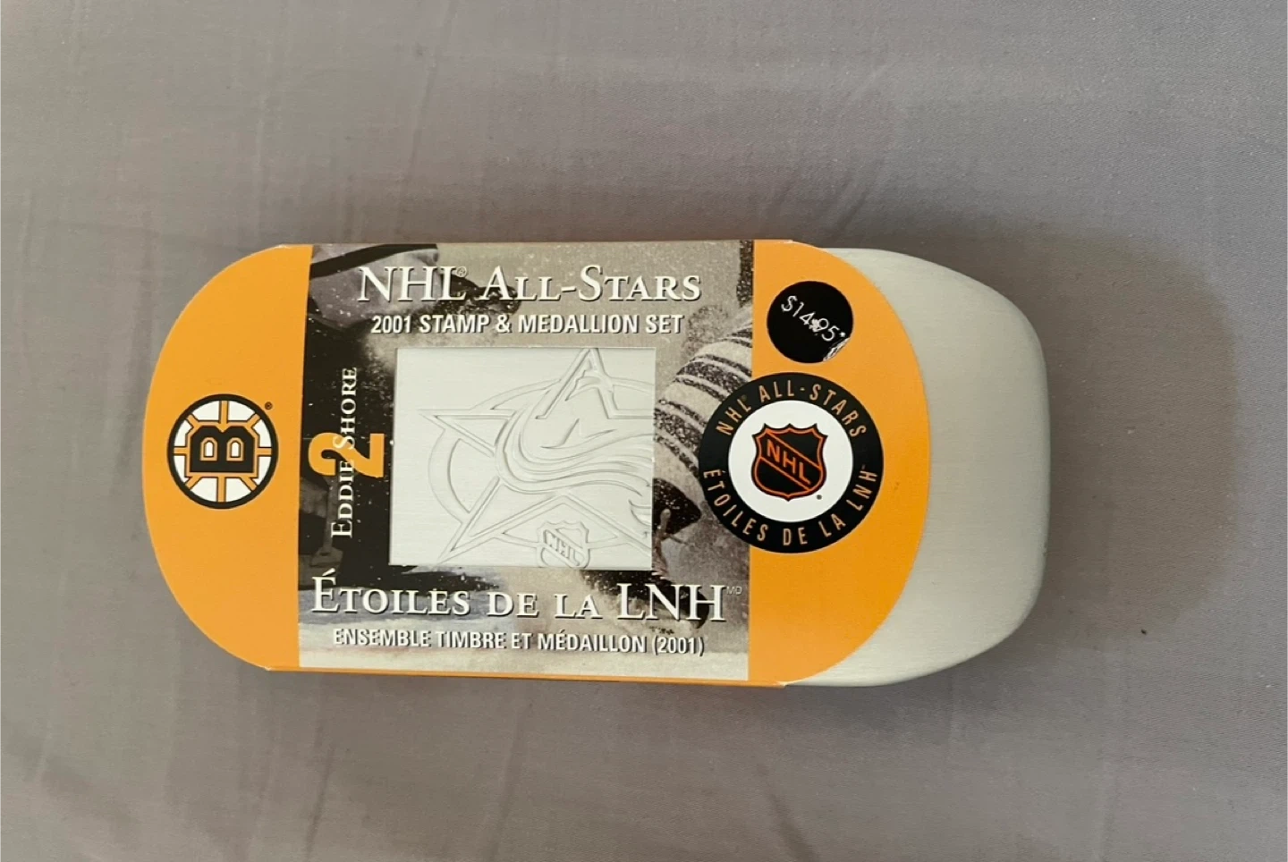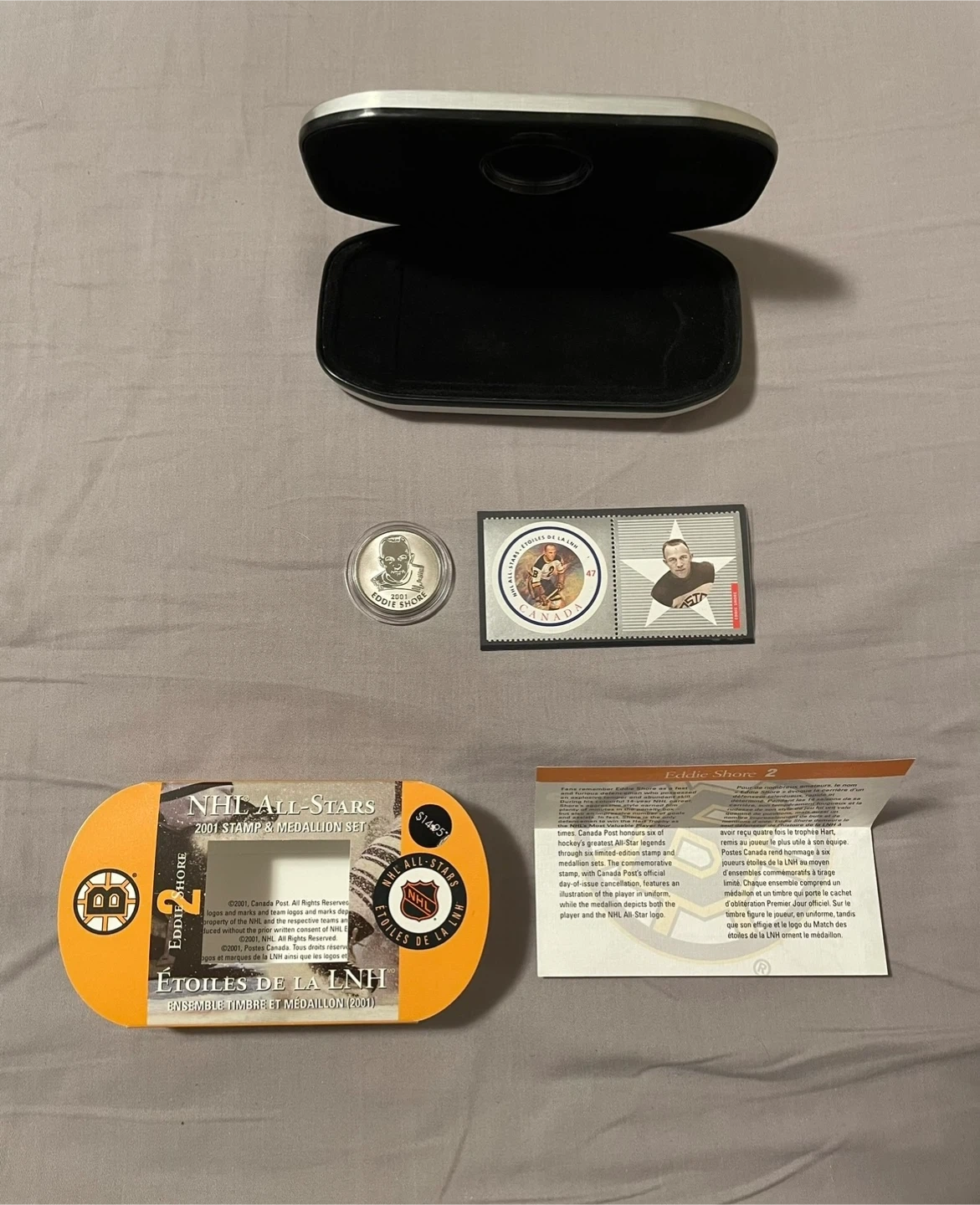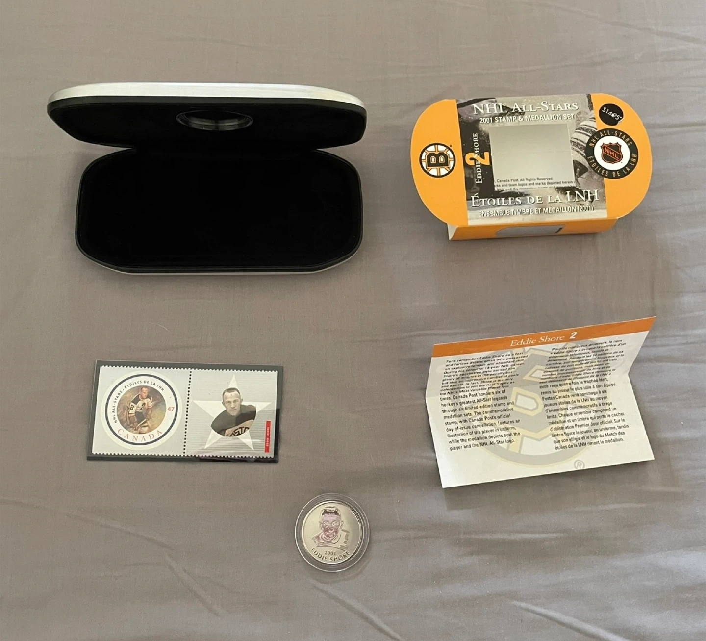 Includes a 2001 stamp and medallion set featuring NHL All-Stars and Eddie Shore. Comes with its original case and packaging.