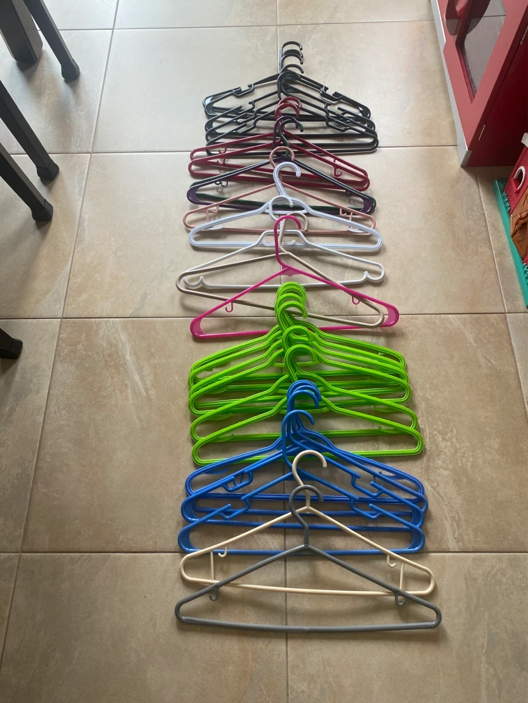 A collection of plastic clothes hangers in various colours, including black, dark red, purple, white, pink, lime green, and blue. These are standard adult-sized hangers for everyday use.