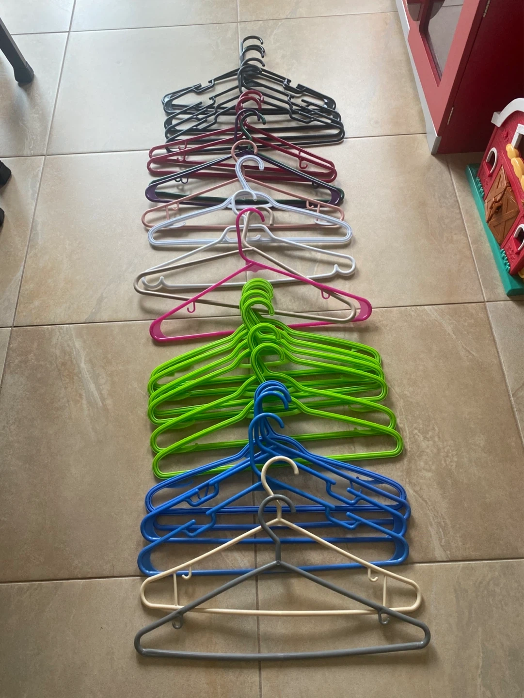 A collection of plastic clothes hangers in various colours, including black, dark red, purple, white, pink, lime green, and blue. These are standard adult-sized hangers for everyday use.