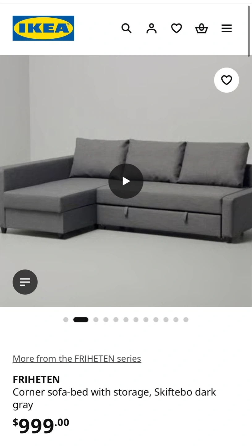 This IKEA FRIHETEN corner sofa-bed offers convenient storage underneath. It's upholstered in Skiftebo dark grey fabric. It easily converts into a bed for guests.