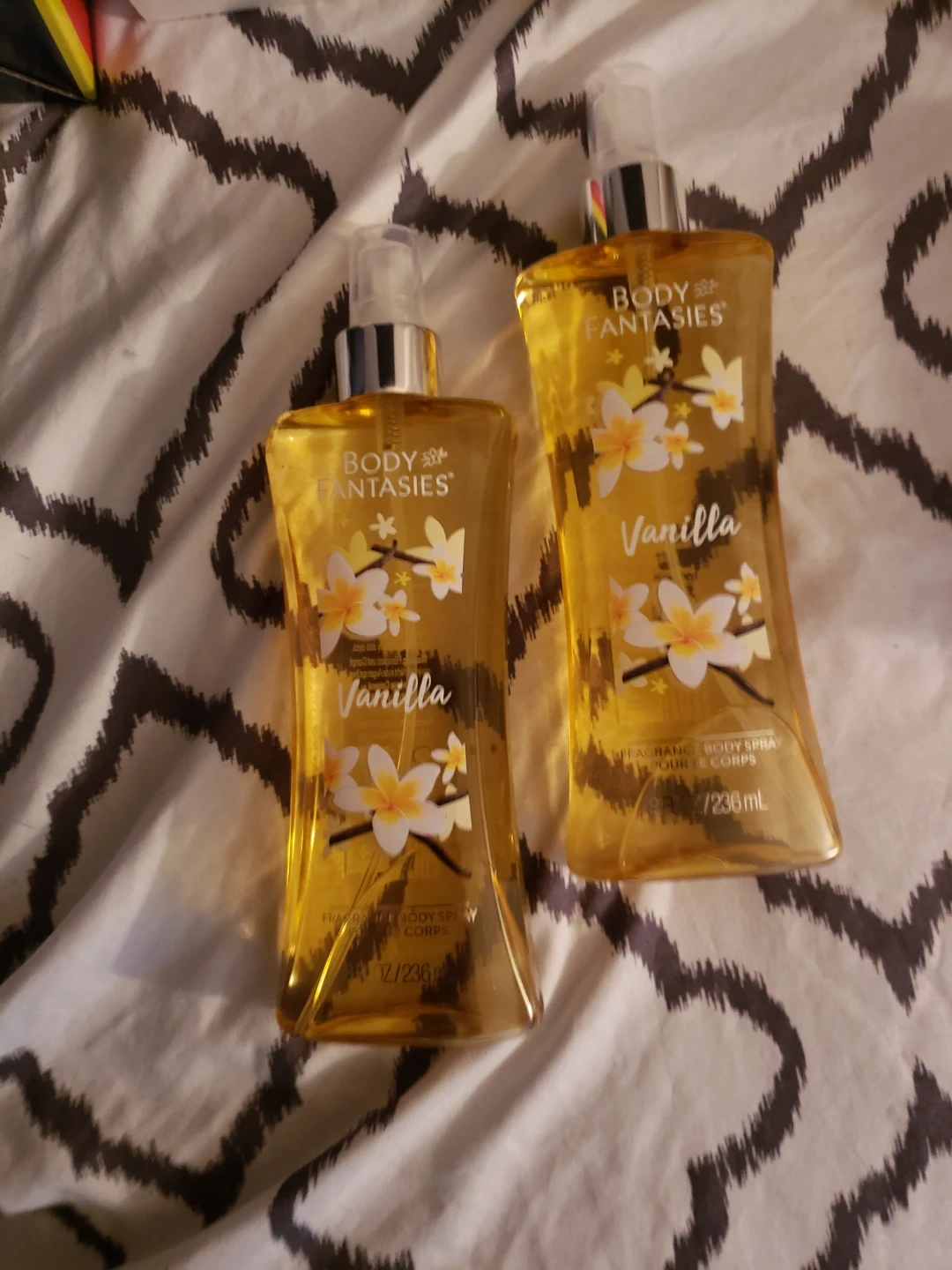 Two bottles of Body Fantasies Vanilla Fragrance Body Spray. Each bottle contains 236ml of product. Vanilla scent.