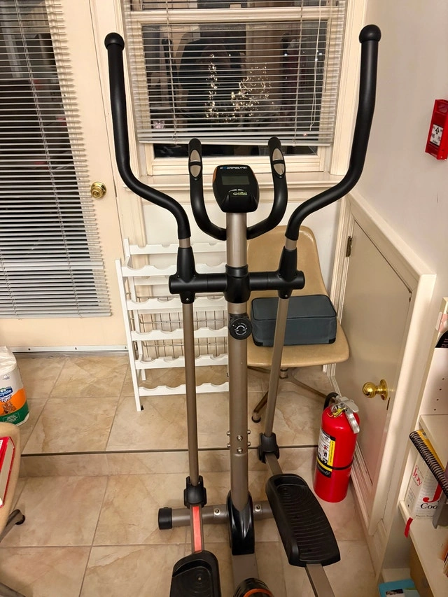 Fully assembled and working elliptical. Needs new batteries for the console. Please note: you will need to remove this from a third-floor apartment without an elevator. Bring a friend! Elliptical dimensions – 23" W x 54" L x 63" H. Item weight – 74.5 lbs. Weight Capacity – 300 lbs. 8 Level magnetic tension resistance adjustments. Easy to read 3.4" large window LCD display shows distance, calories burned, time, speed, pulse, and scan. Bluetooth Smart Cloud Fitness with the free MyCloudFitness app available on Android and iOS to track your workouts. 3 Workout goal settings via MyCloudFitness App: time, distance, and calories burned.