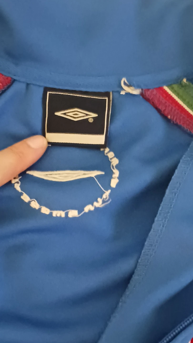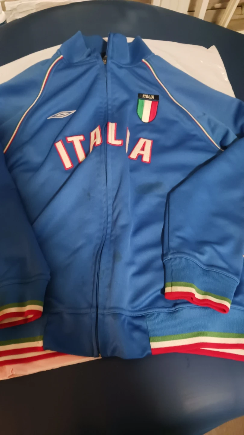 Blue Umbro track jacket with "ITALIA" text on the front. Features the Italian flag crest on the chest. Ribbed cuffs and hem with red, white, and green stripes. Some minor spots are visible on the front. Some marks on elbows!