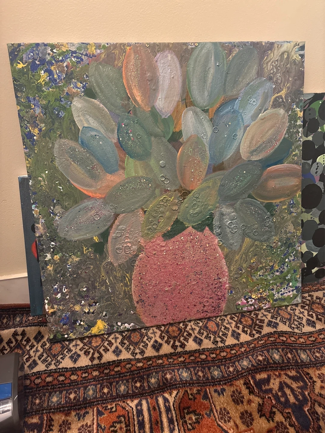 This is an original painting featuring a vibrant bouquet of flowers in a pink vase. The artwork has a textured finish with subtle glitter accents, creating a unique visual effect. It's a beautiful piece for adding colour to any room! it has glow in the dark and UV light reacting paint