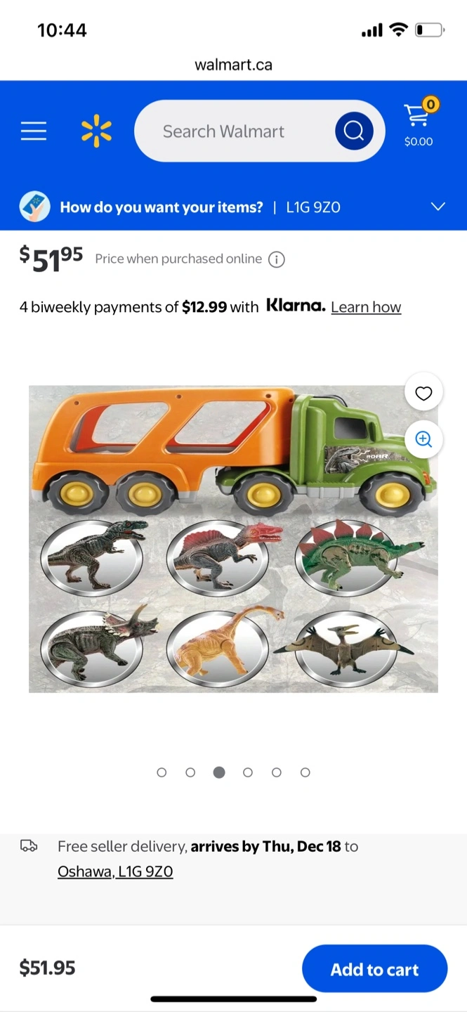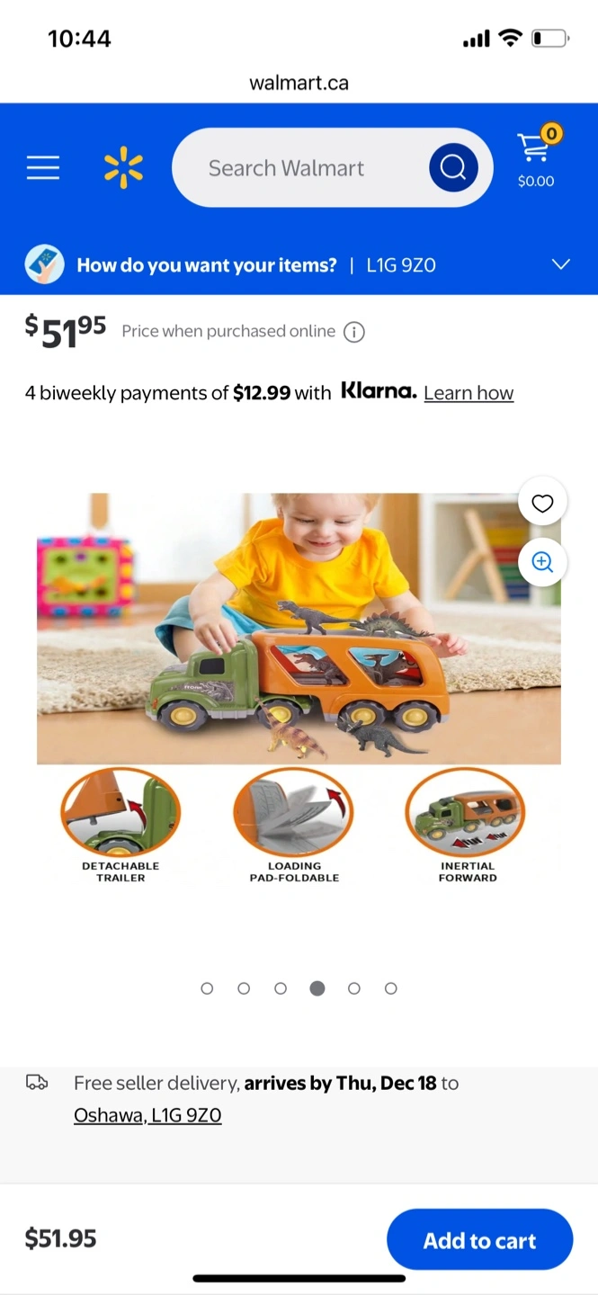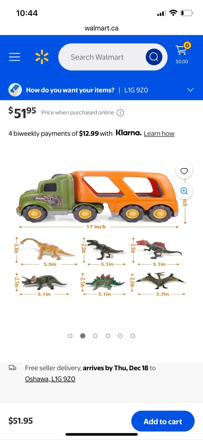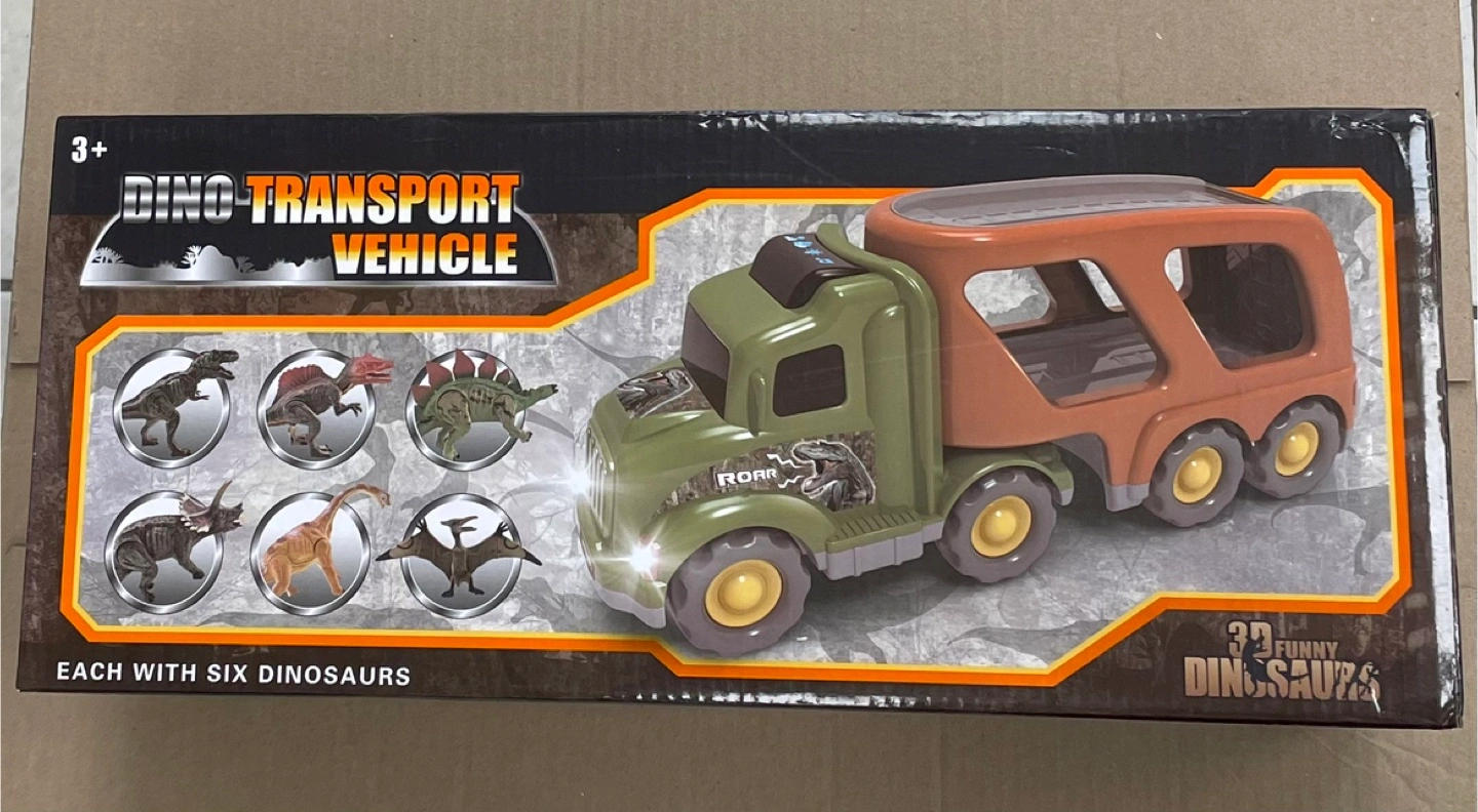 This is a fun dinosaur transporter truck toy! The truck is green and orange and comes with several dinosaur figures. It has a detachable trailer and a loading pad that folds down. The dimensions of the dinosaurs are shown in one of the pictures. Originally bought for $51.95