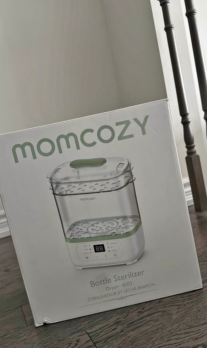 Momcozy bottle sterilizer and dryer, model BS02. It's white and green with a clear BPA-free container. Features a digital display for settings.