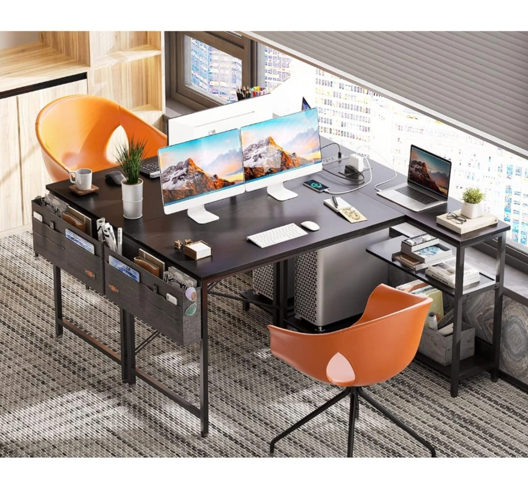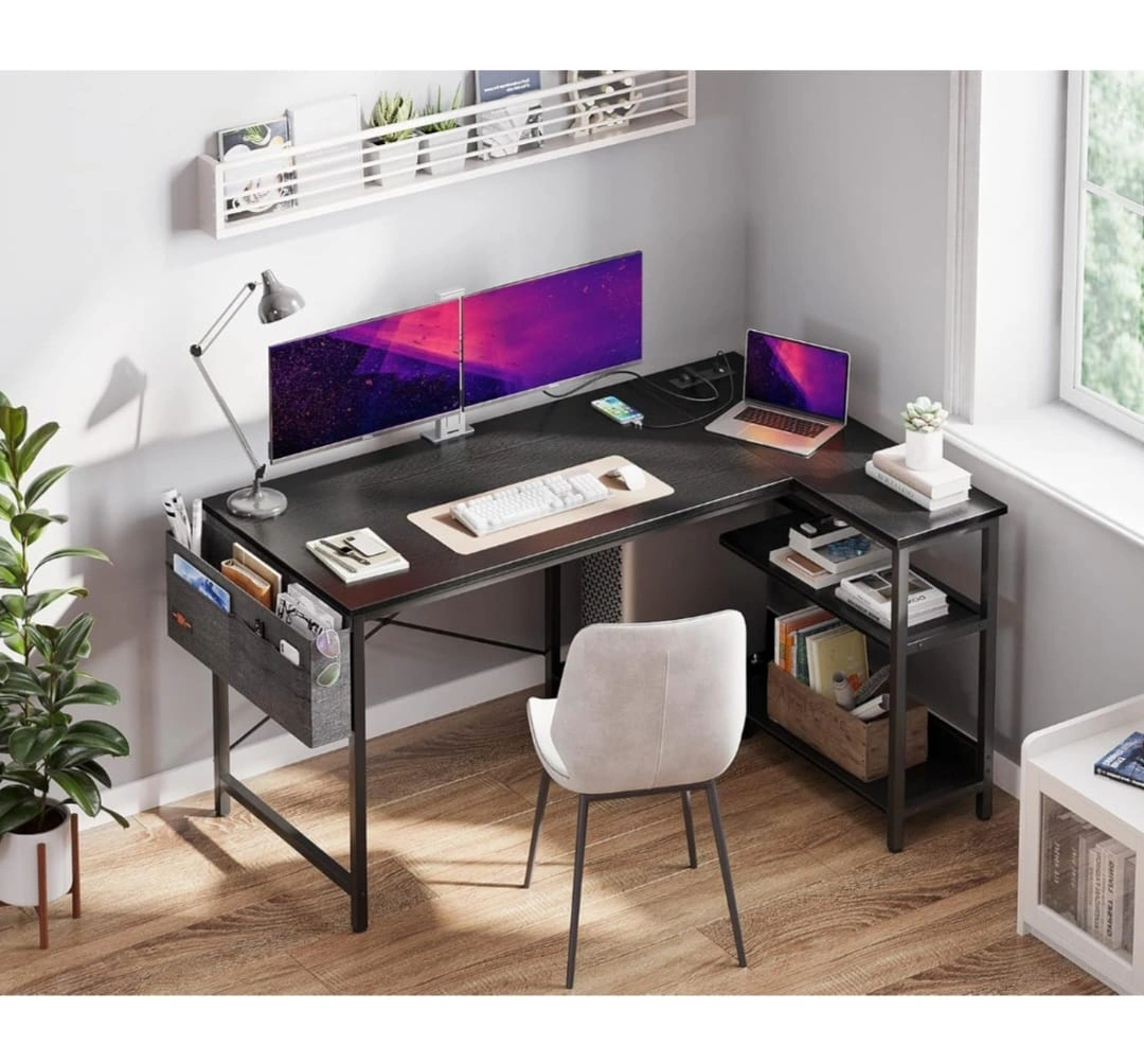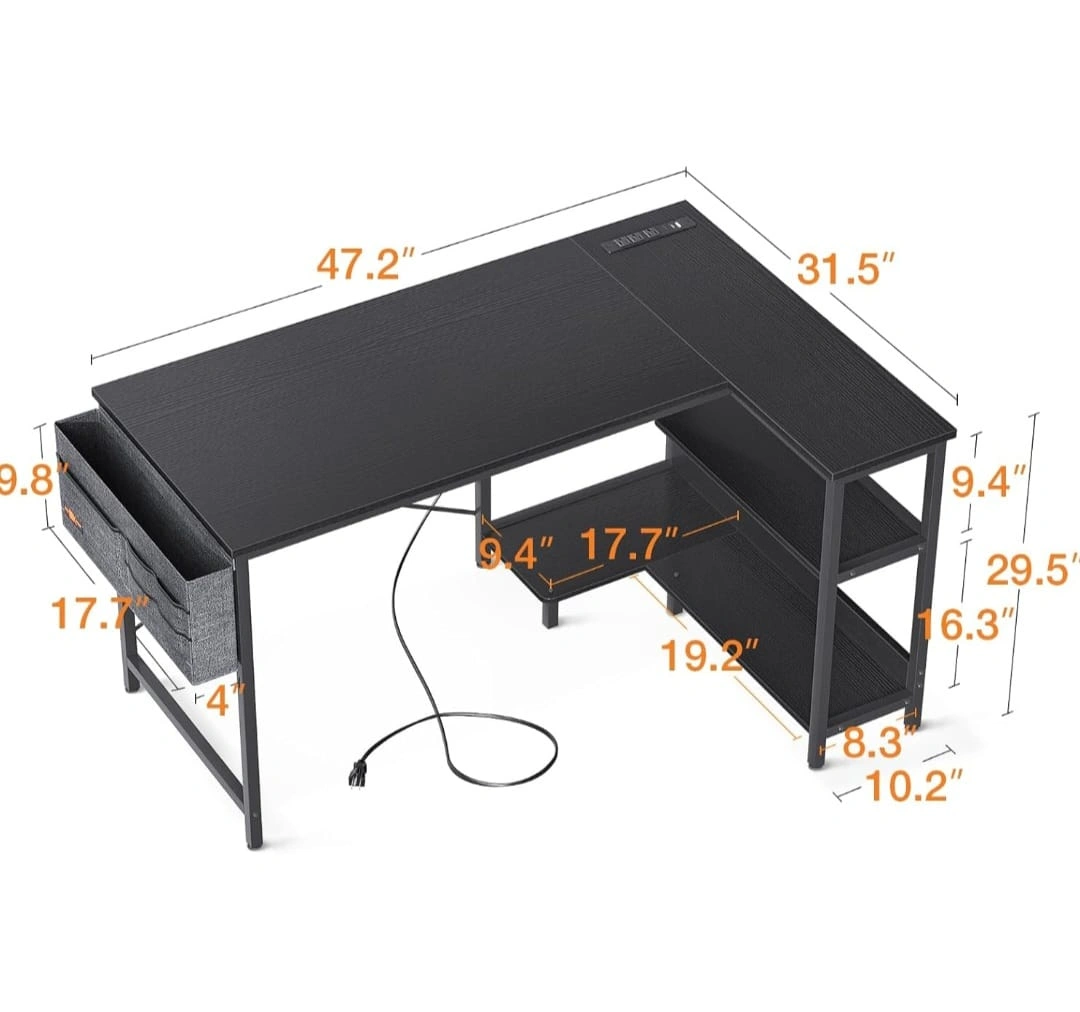 Spacious L-shaped desk, black finish. Metal frame. Includes side shelving and fabric storage pockets. Great for home office or gaming setup. Durable and stylish.