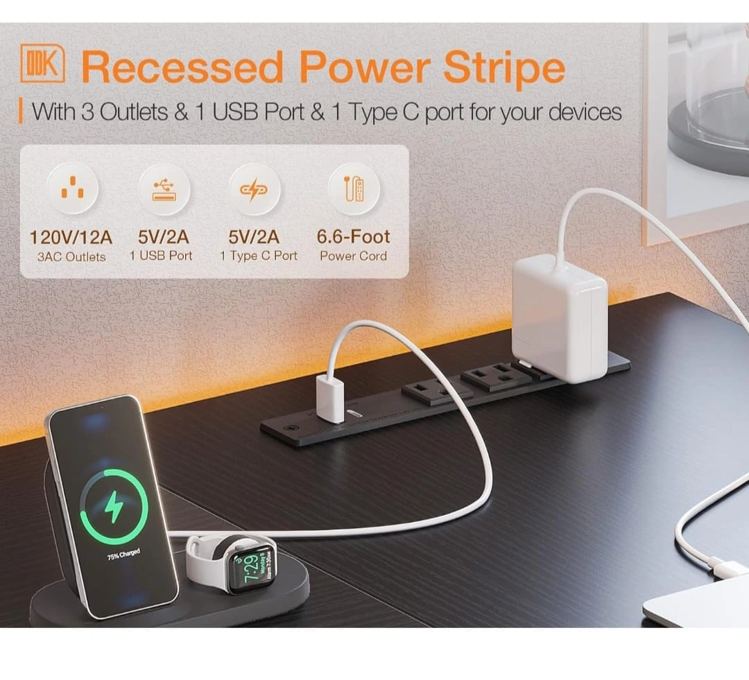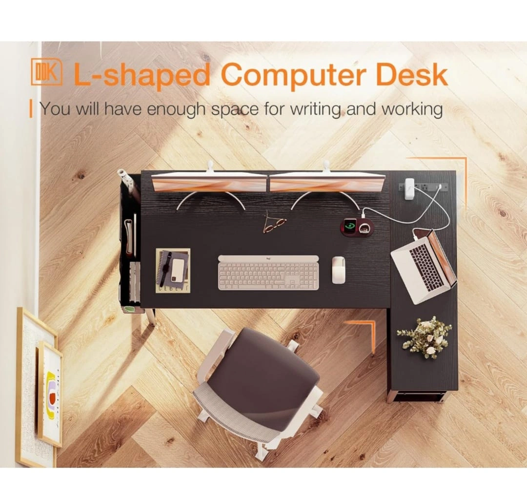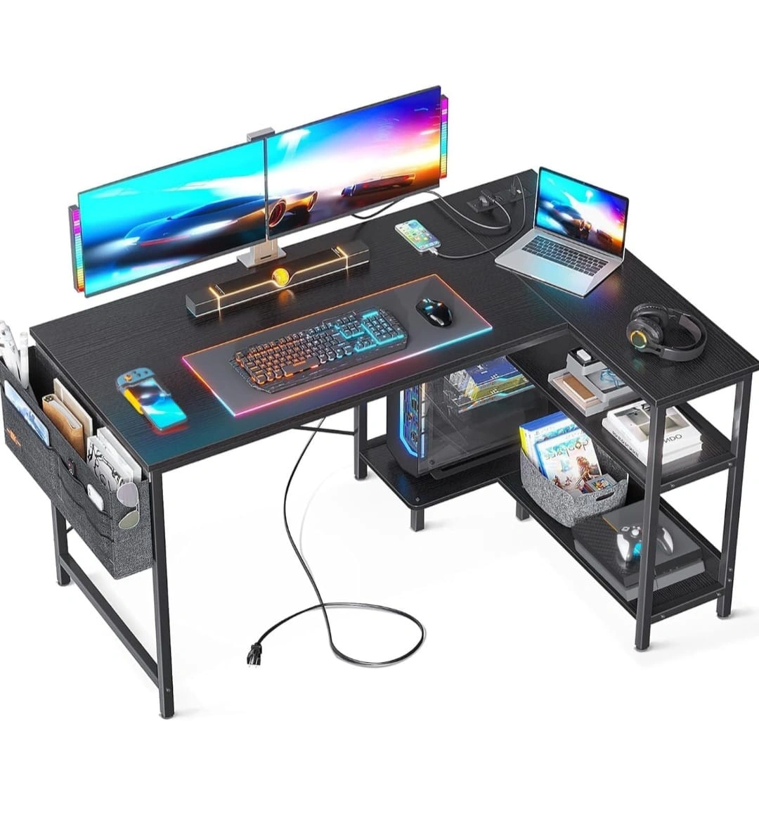 Spacious L-shaped desk, black finish. Metal frame. Includes side shelving and fabric storage pockets. Great for home office or gaming setup. Durable and stylish.