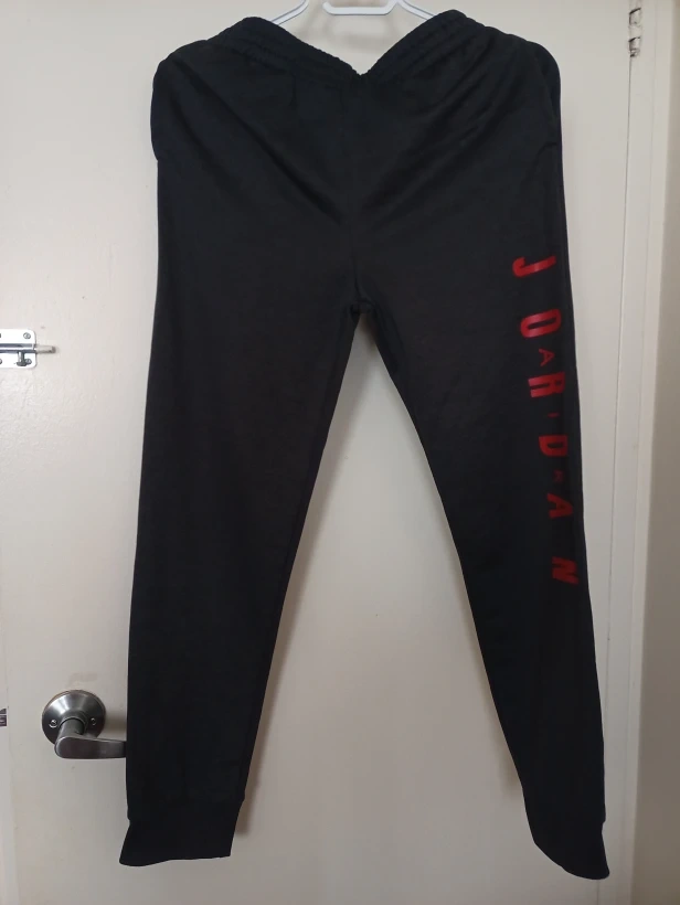 Selling a pair of Jordan track pants in black. They feature the Jordan logo in red down the side of the leg. Perfect for workouts or just lounging around!