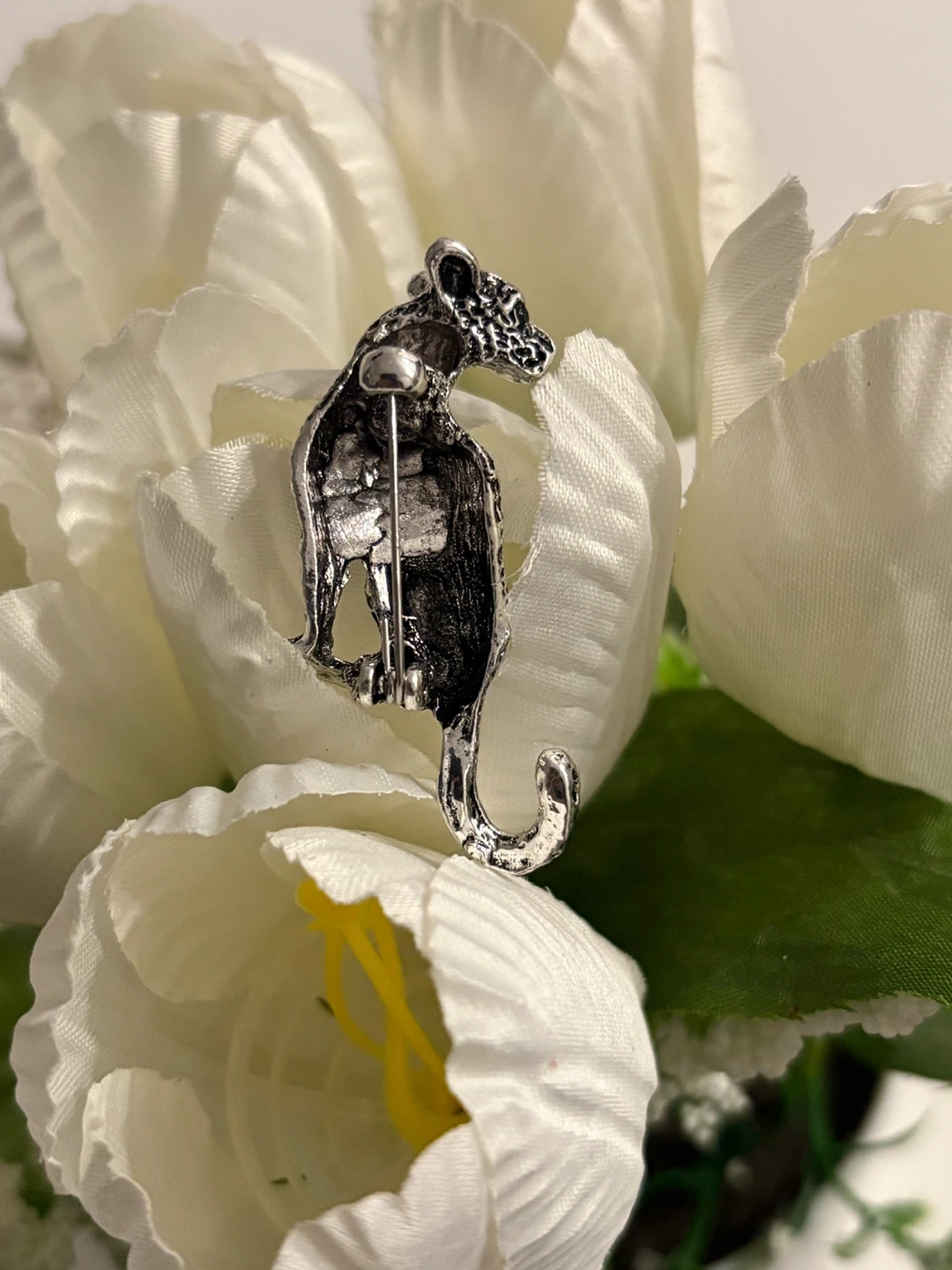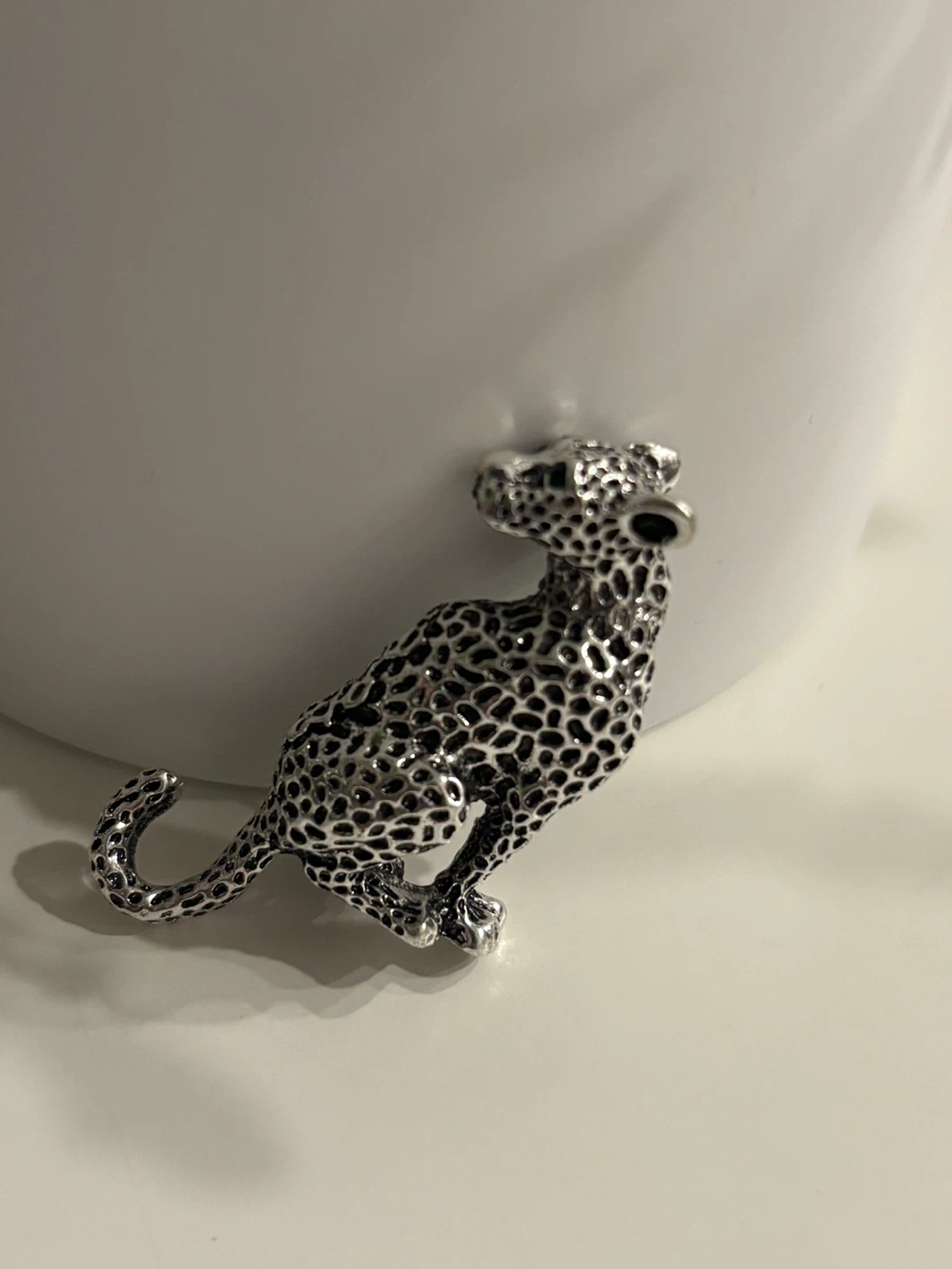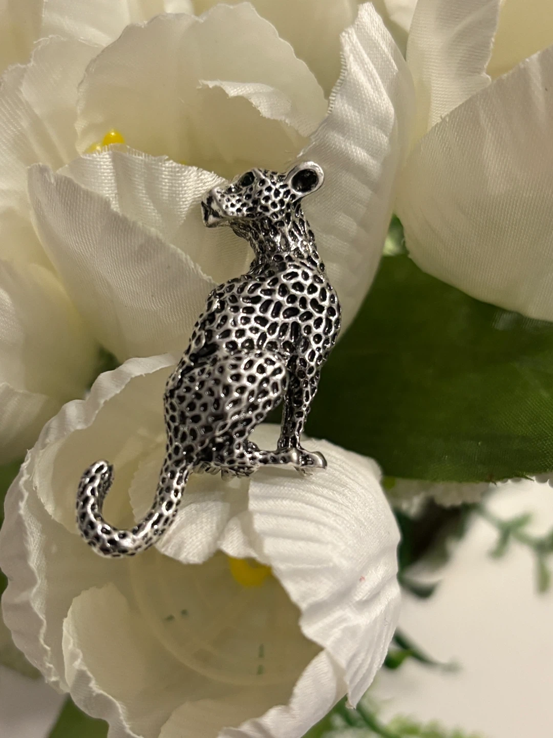 This silver-tone brooch features a detailed leopard design. It's perfect for adding a touch of wildlife flair to your outfits. The pin backing is secure for easy attachment.