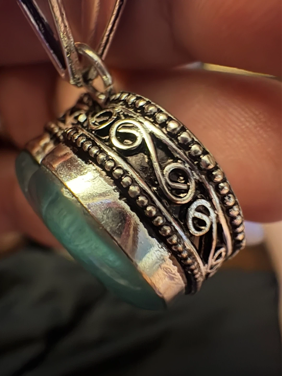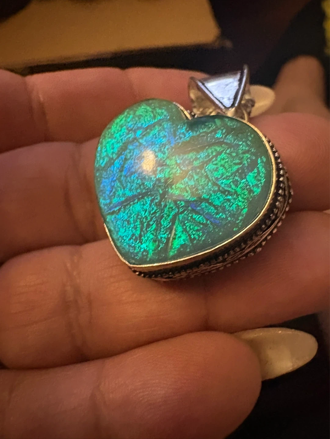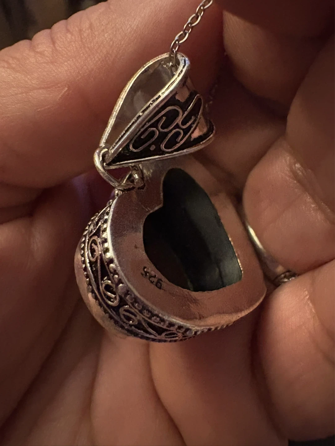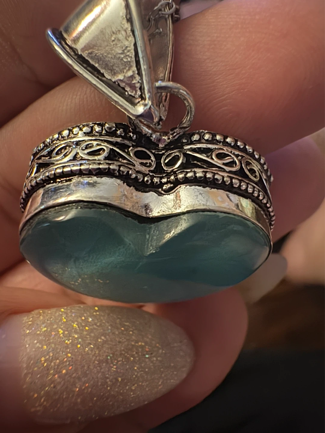 This 925 Sterling Silver heart pendant necklace features a striking turquoise-colored moon stone. The chain is stamped "925" indicating sterling silver. It comes in a black jewelry box. NEW