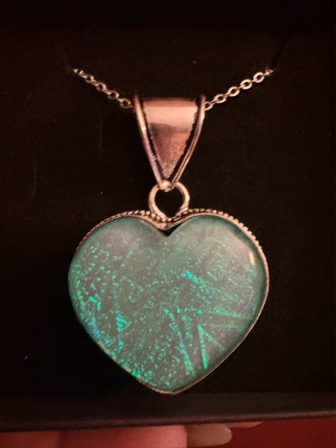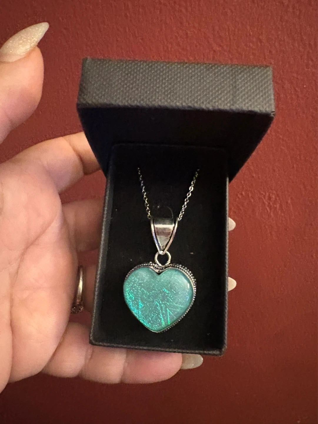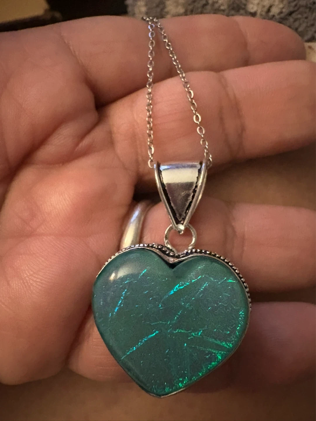 This 925 Sterling Silver heart pendant necklace features a striking turquoise-colored moon stone. The chain is stamped "925" indicating sterling silver. It comes in a black jewelry box. NEW
