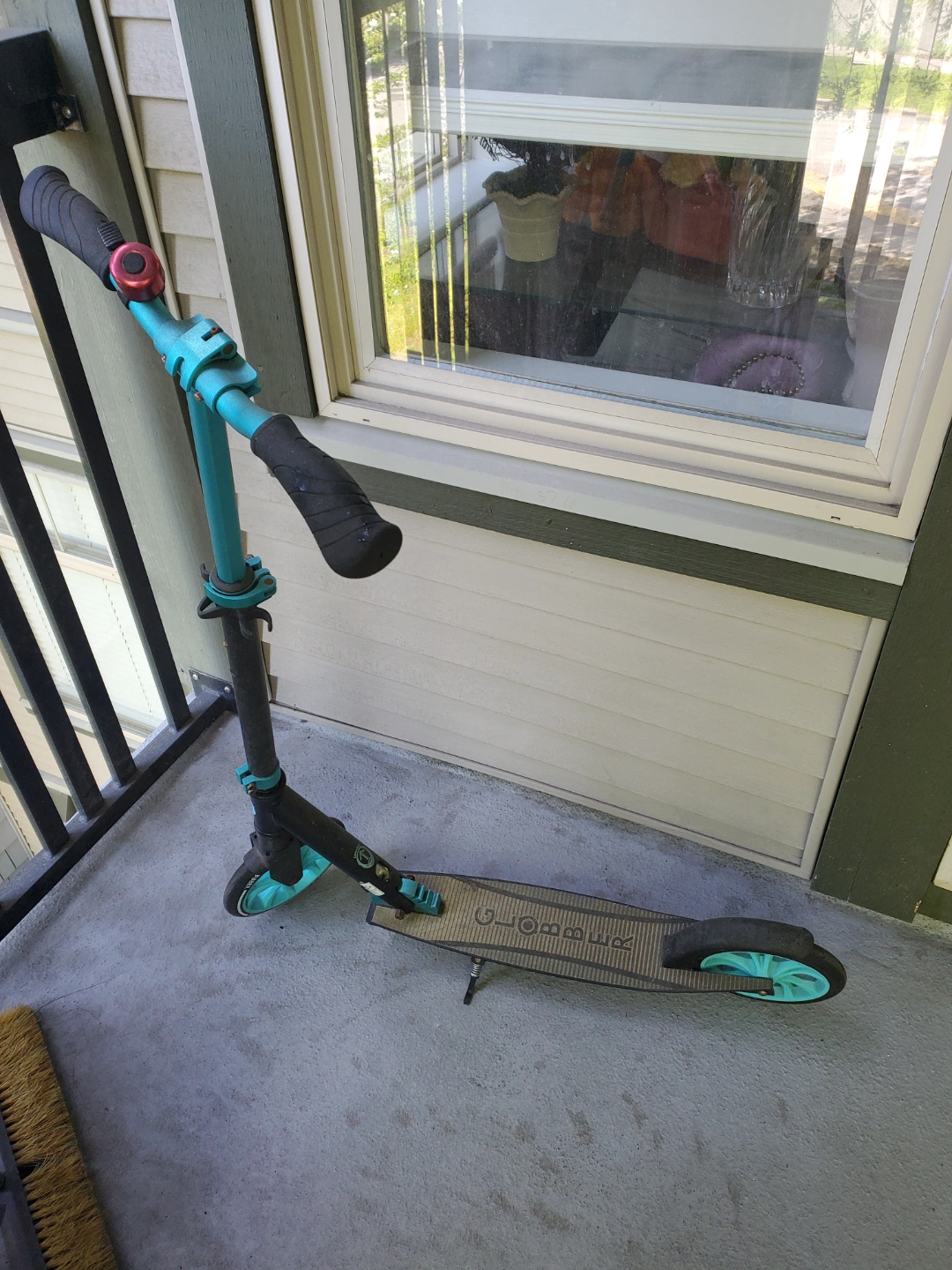 Teal and black foldable scooter. Features a bell and comfortable grips. Suitable for children and adults.