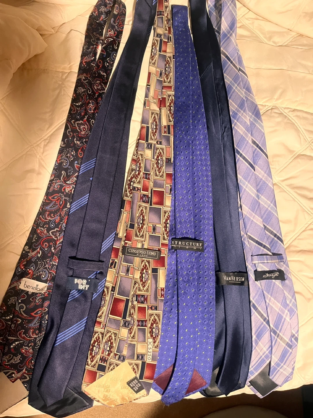 Selling a collection of men's ties in great condition! Brands include Benetton, For Int, Consenso Uomo, Structure, Van Heusen, and Sharpe. A variety of colours and patterns to choose from