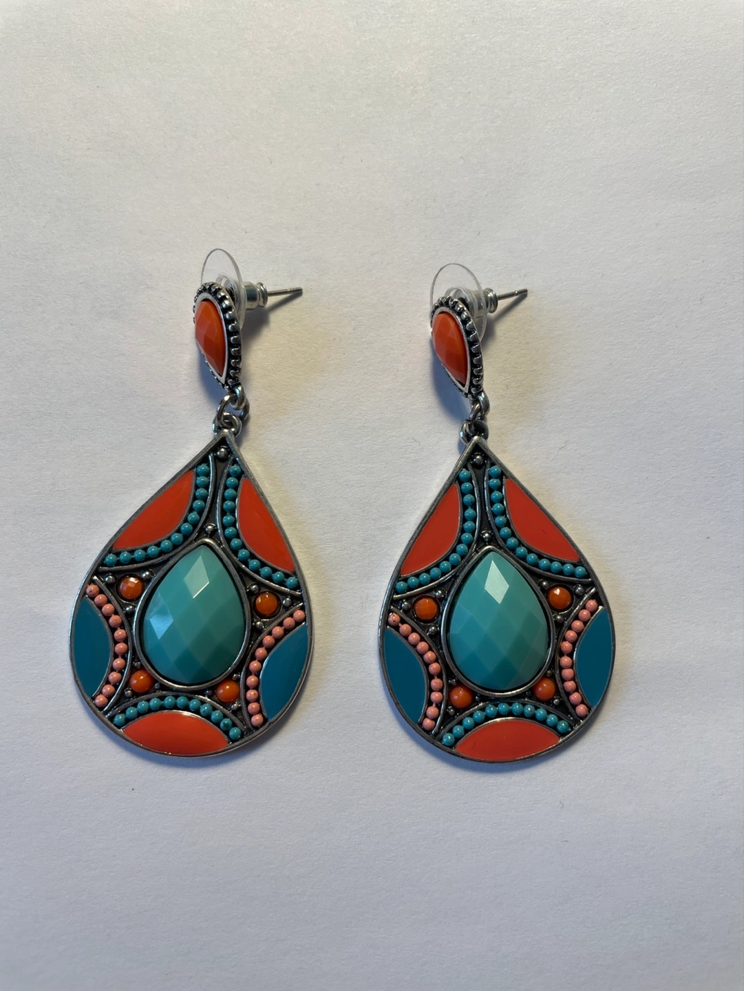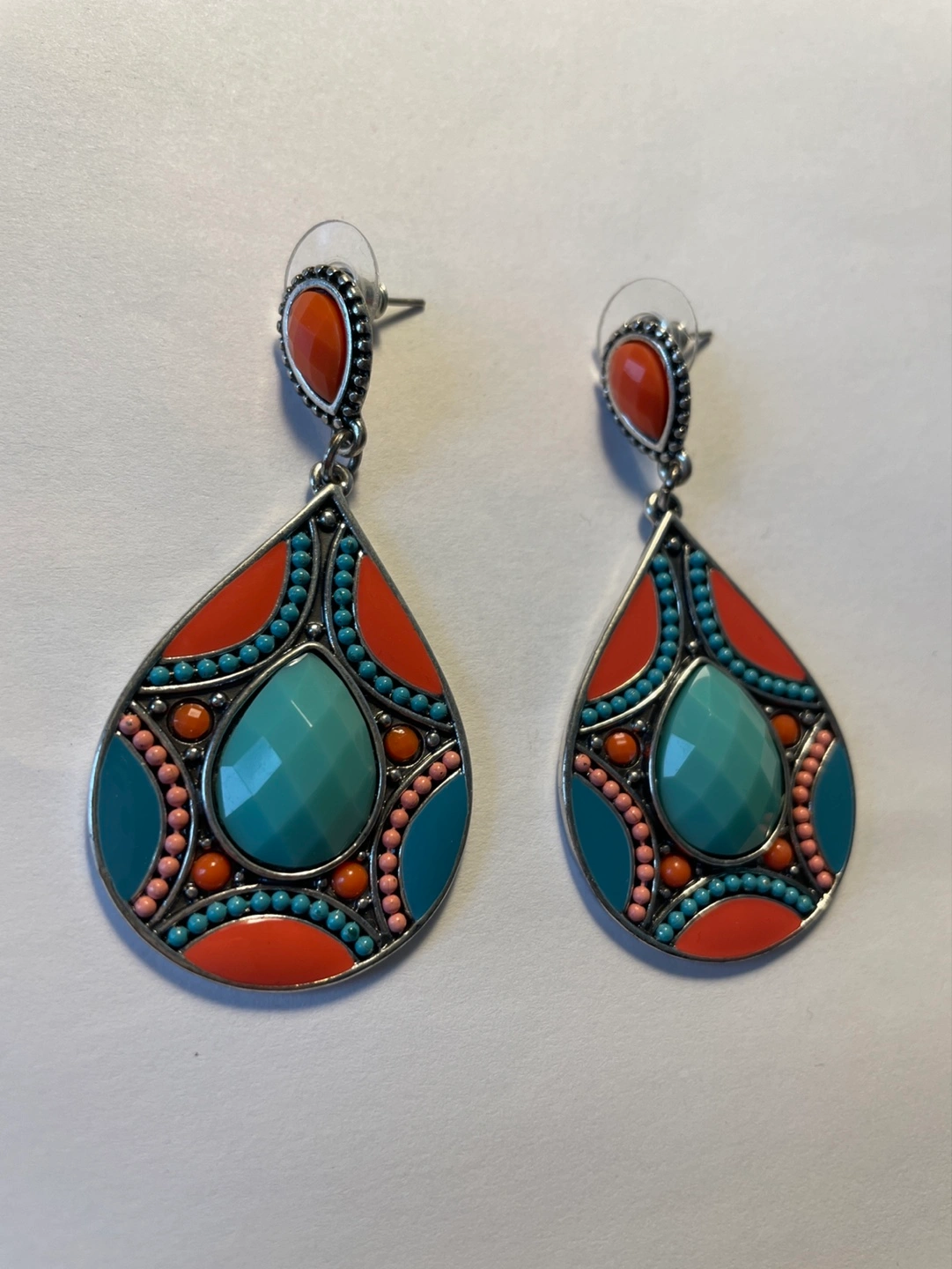 Beautiful pair of teardrop dangle earrings. Features turquoise and coral coloured beads and stones. Silver-toned metal. Unique design. Never worn.