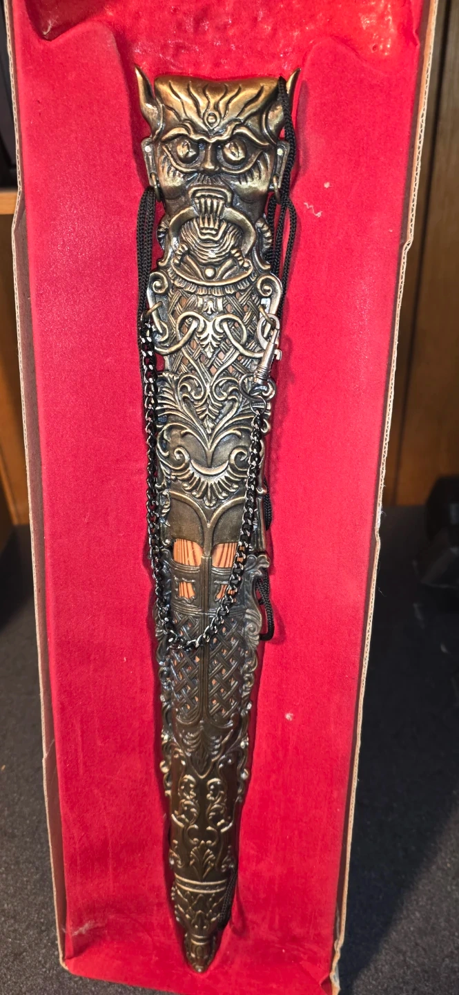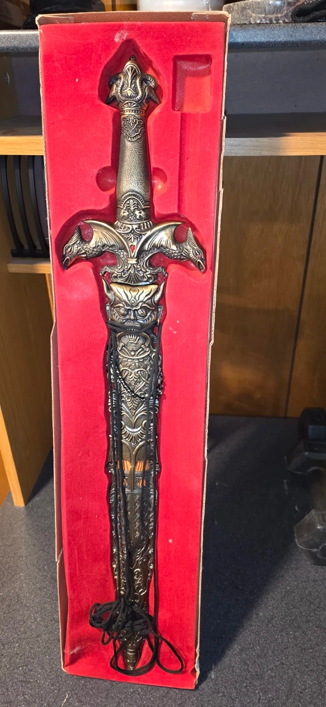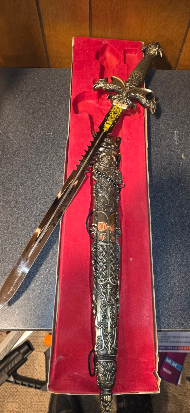 This decorative sword features an ornate, dragon-themed scabbard and hilt. It's designed for display and includes a matching scabbard. The metallic finish has intricate detailing throughout. It's a unique piece for collectors or display enthusiasts!