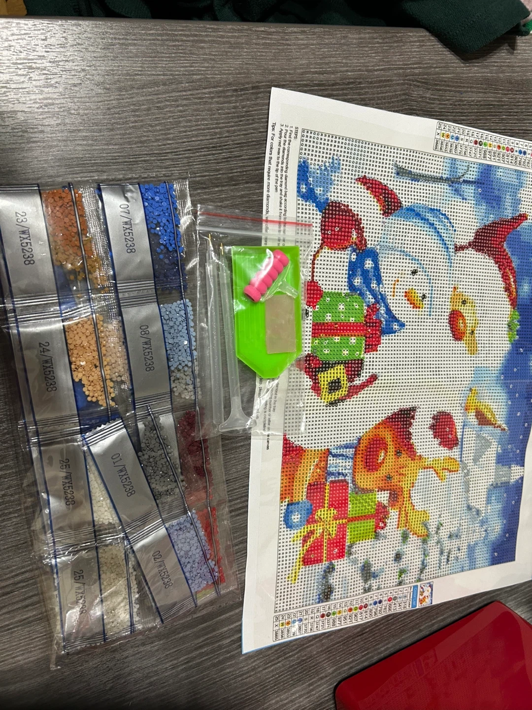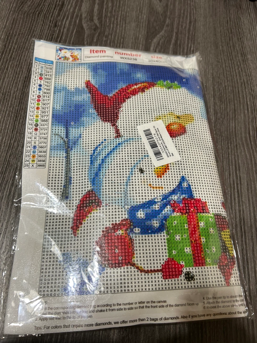 New Unopened diamond painting kit featuring a snowman and a dog. Includes canvas, beads, and tools. Size 30x40cm. Perfect for a cozy winter craft project!