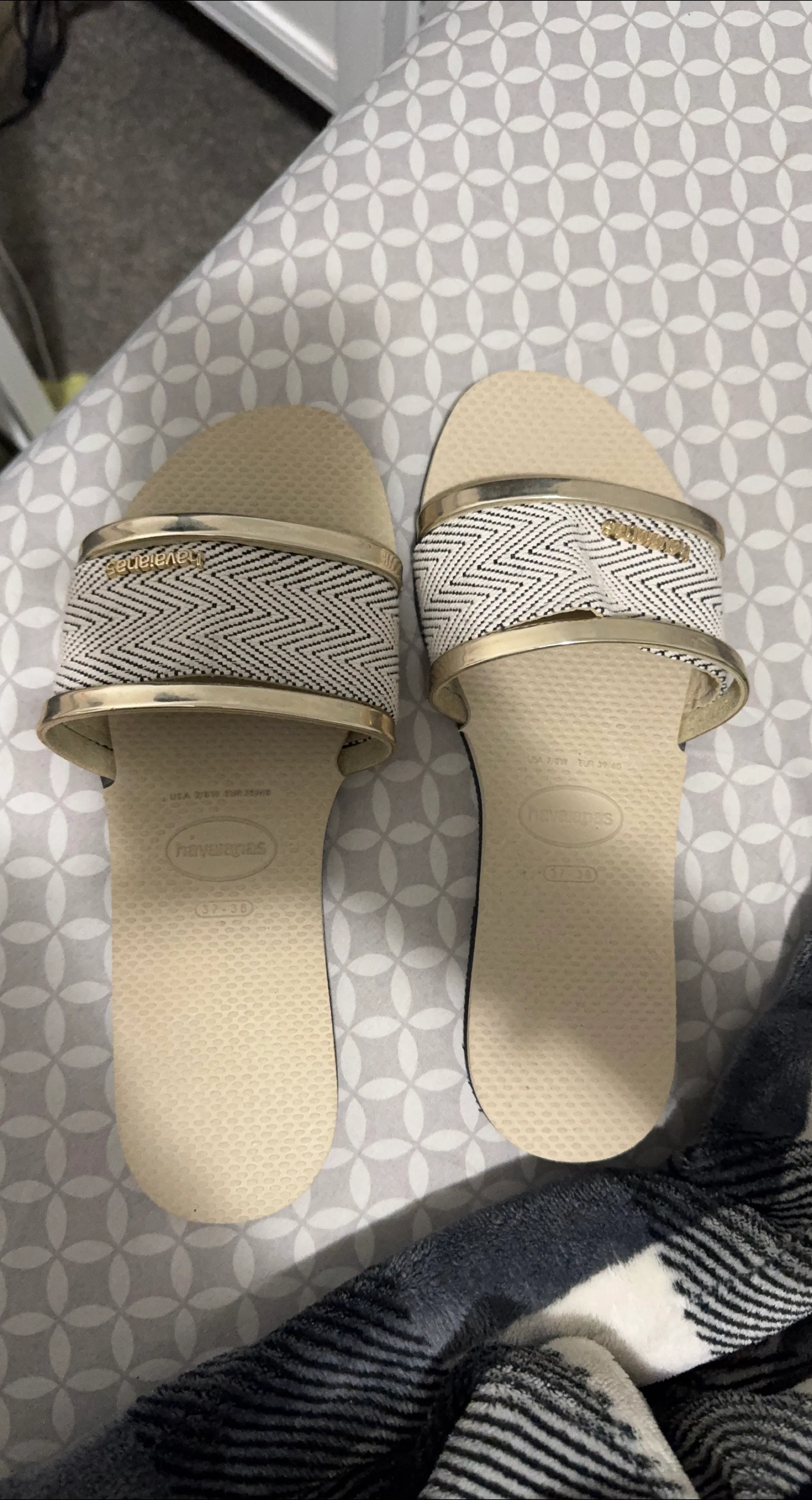 Cute Havaianas sandals! They are a size 7/8 US, which is 39/40 in European sizing. The straps have a black and white woven pattern with gold accents.