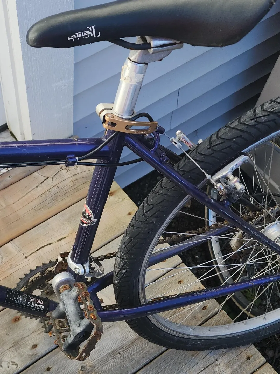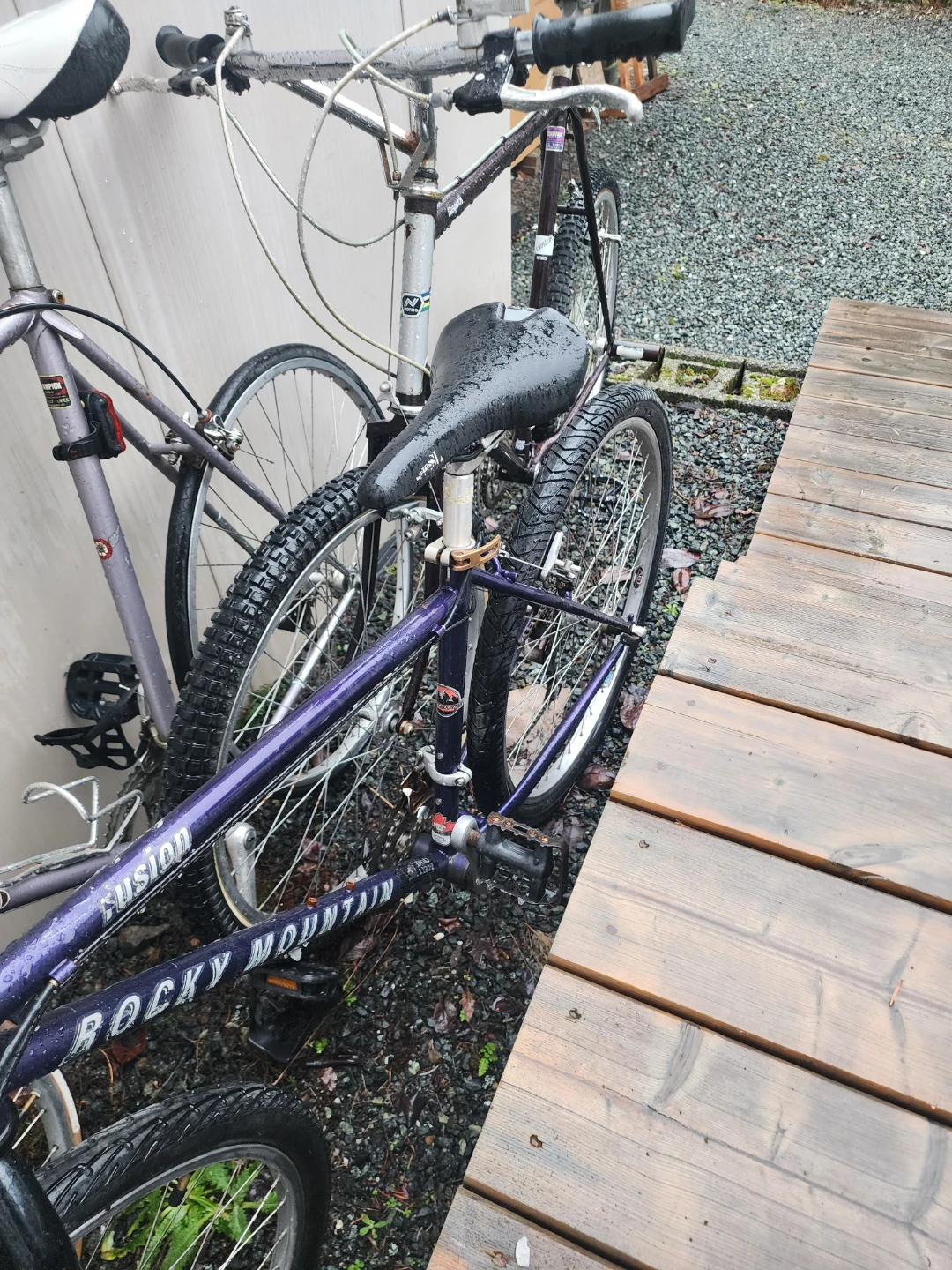 A purple Rocky Mountain Fusion mountain bike. This bike is great for hitting trails or casual rides around town. It's a reliable option for getting some exercise and enjoying the outdoors!