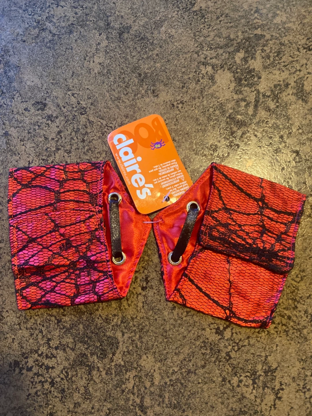 Get ready for Halloween with this Claire's costume accessory set! It includes a variety of fun pieces to complete your spooky look. The set includes black lace gloves, black tights with pink glitter spiderweb design, black and red lace wrist cuffs, and a black and red bow headband with clasp. All in new, still in original packaging! Original price for all was $27. Selling all for $17 or can be sold separately.
