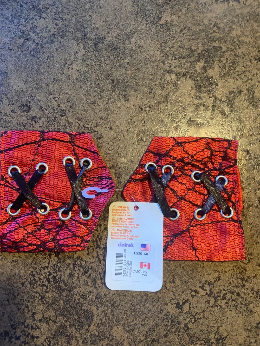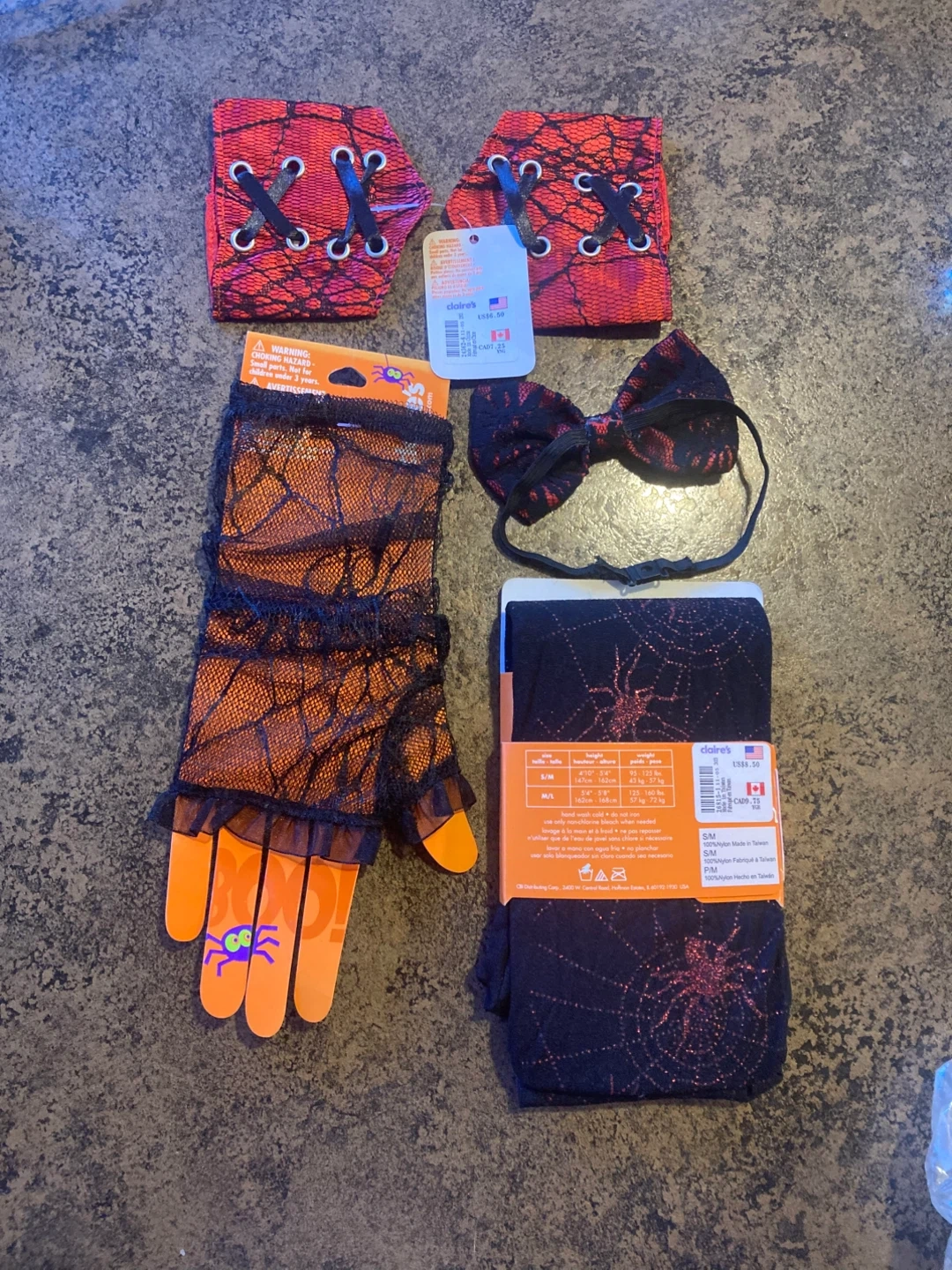 Get ready for Halloween with this Claire's costume accessory set! It includes a variety of fun pieces to complete your spooky look. The set includes black lace gloves, black tights with pink glitter spiderweb design, black and red lace wrist cuffs, and a black and red bow headband with clasp. All in new, still in original packaging! Original price for all was $27. Selling all for $17 or can be sold separately.