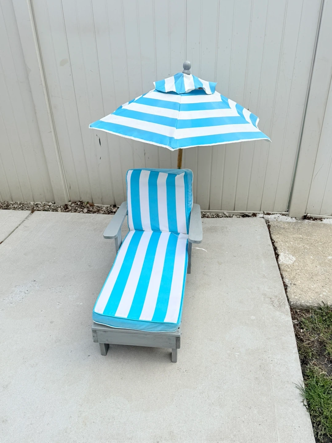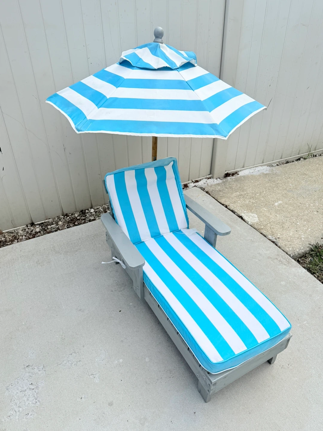 This is a cute beach chair for kids, complete with a matching striped umbrella. It's perfect for little ones to relax in at the beach or in the backyard. The chair features a gray frame with a comfy blue and white striped cushion. It's a fun way for kids to enjoy sunny days!