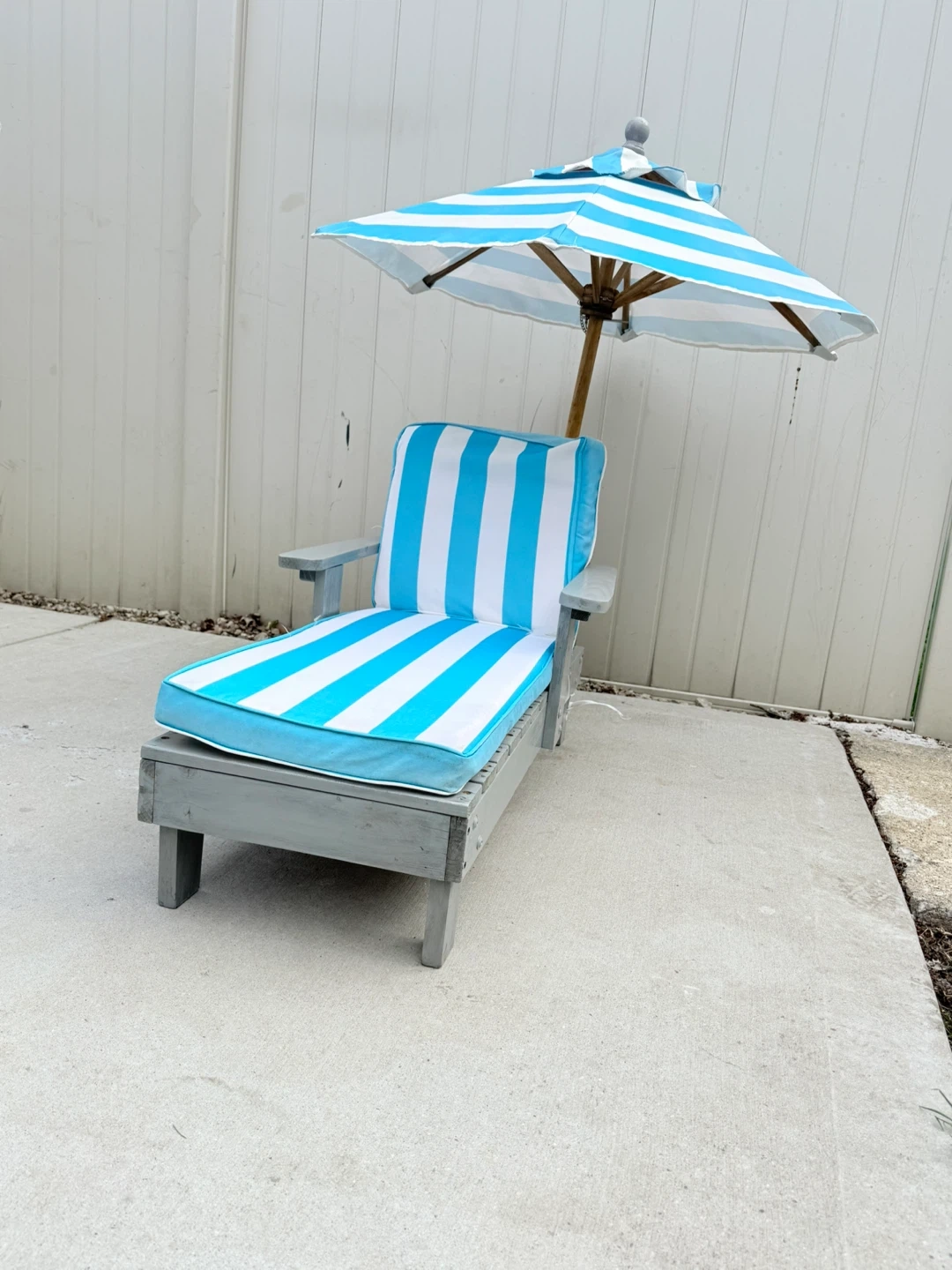 This is a cute beach chair for kids, complete with a matching striped umbrella. It's perfect for little ones to relax in at the beach or in the backyard. The chair features a gray frame with a comfy blue and white striped cushion. It's a fun way for kids to enjoy sunny days!
