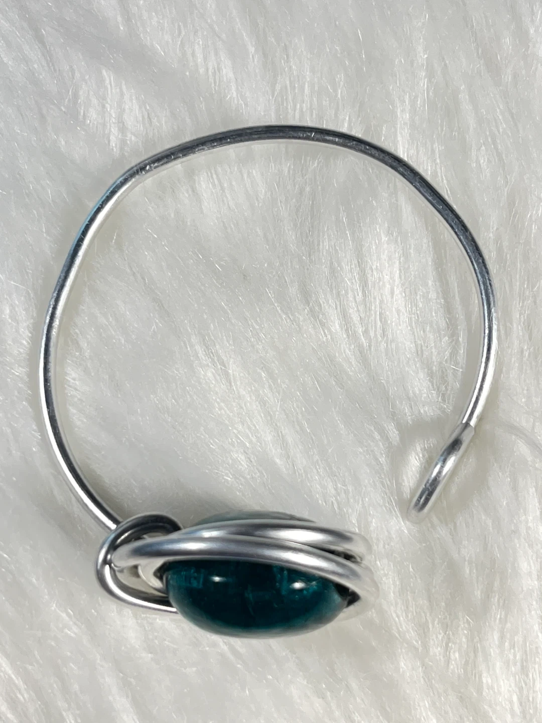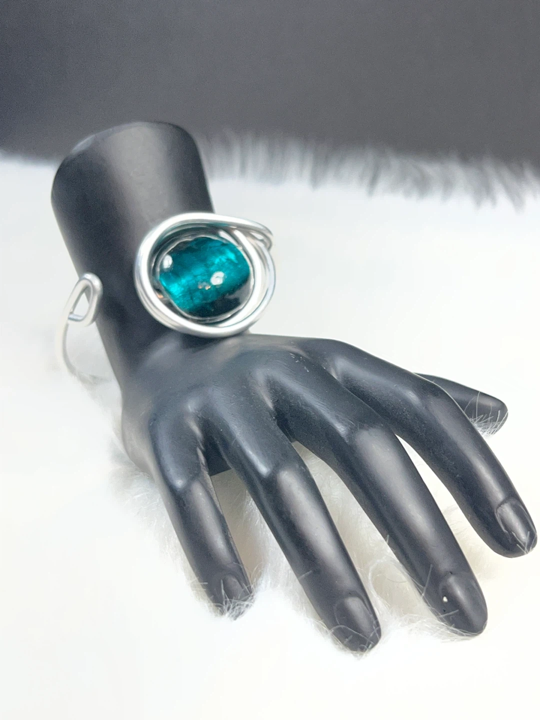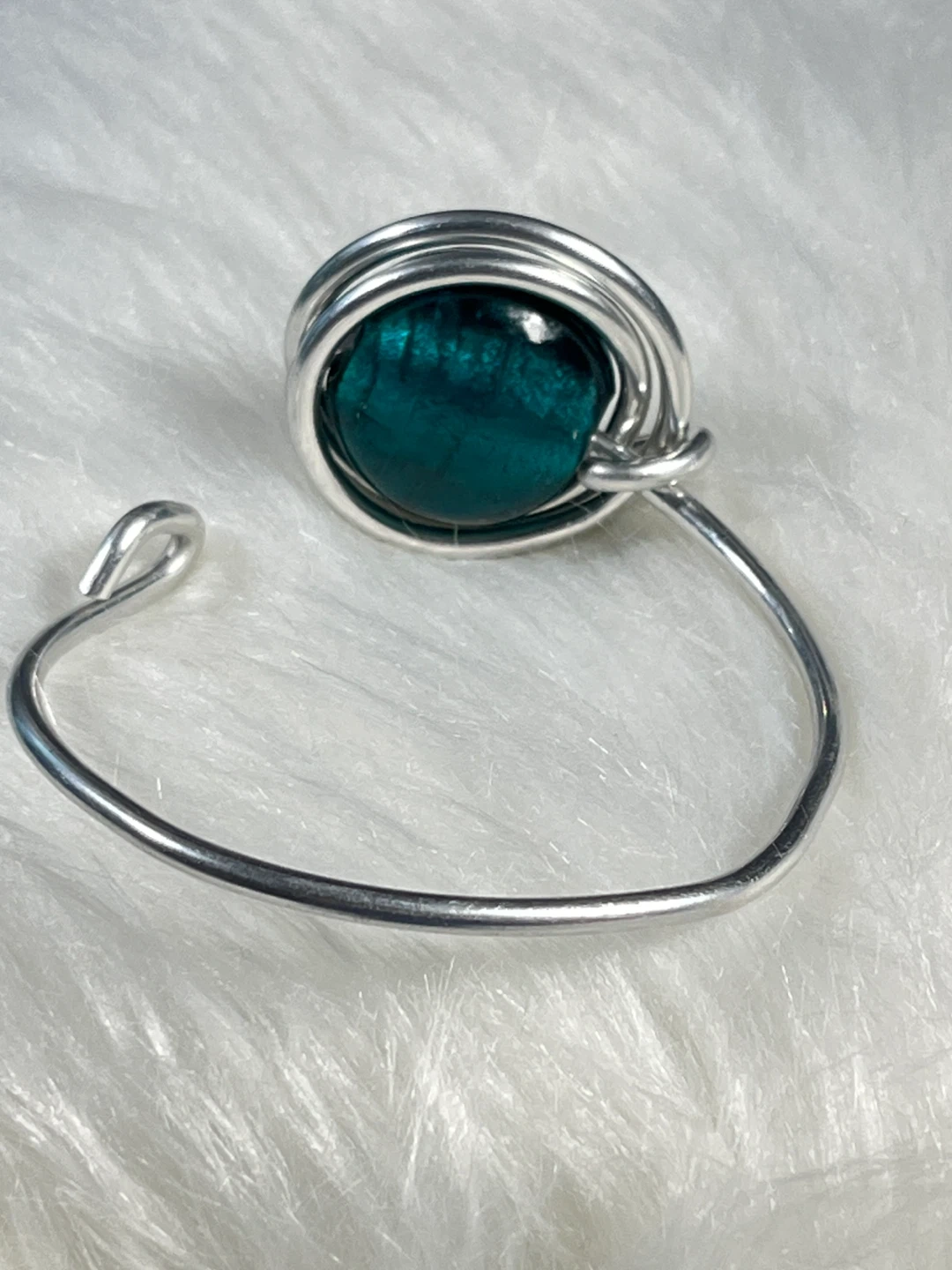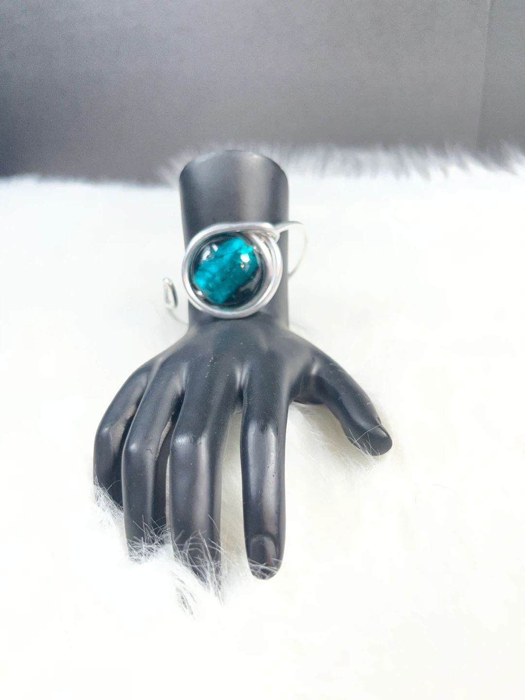 This cuff bracelet features a large, striking blue glass cabochon securely wrapped in silver-toned wire. It's designed to fit most wrists.